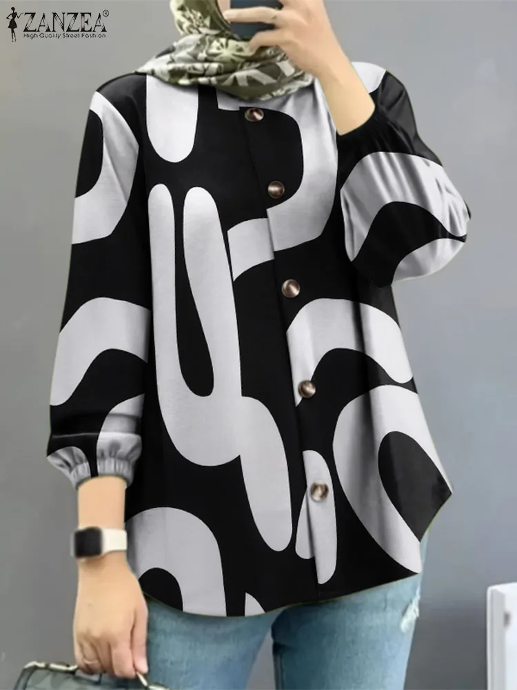 Autumn floral fashion printed shirt women's round neck long sleeve blouse Muslim abaya casual button work tops for women.