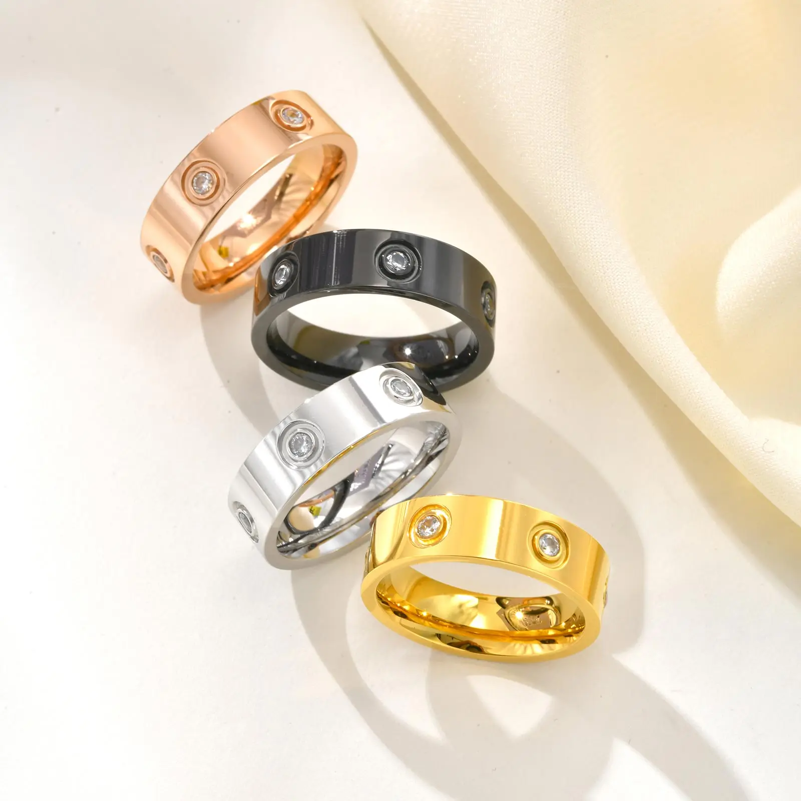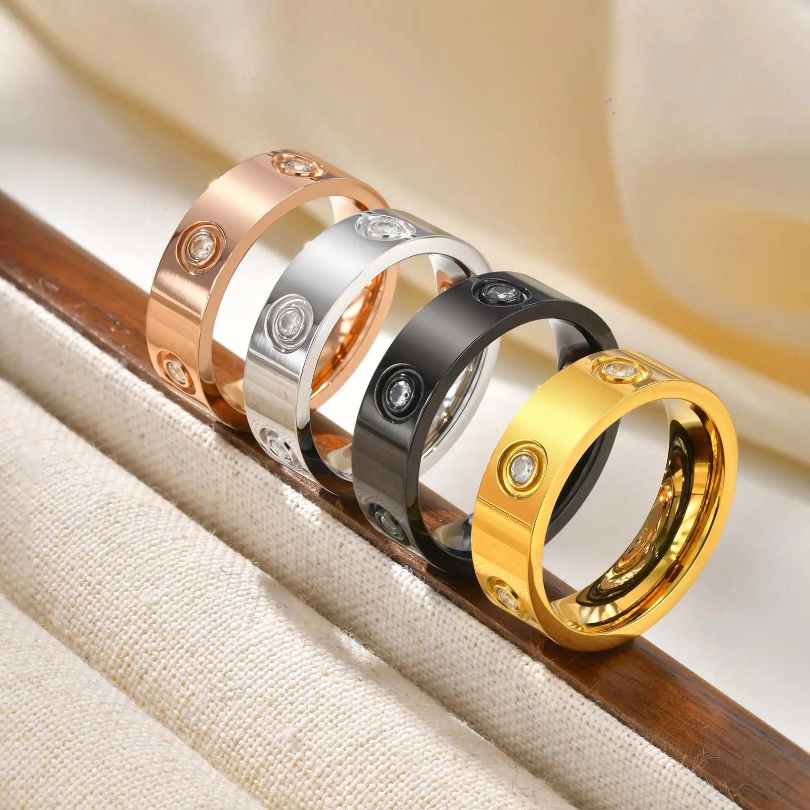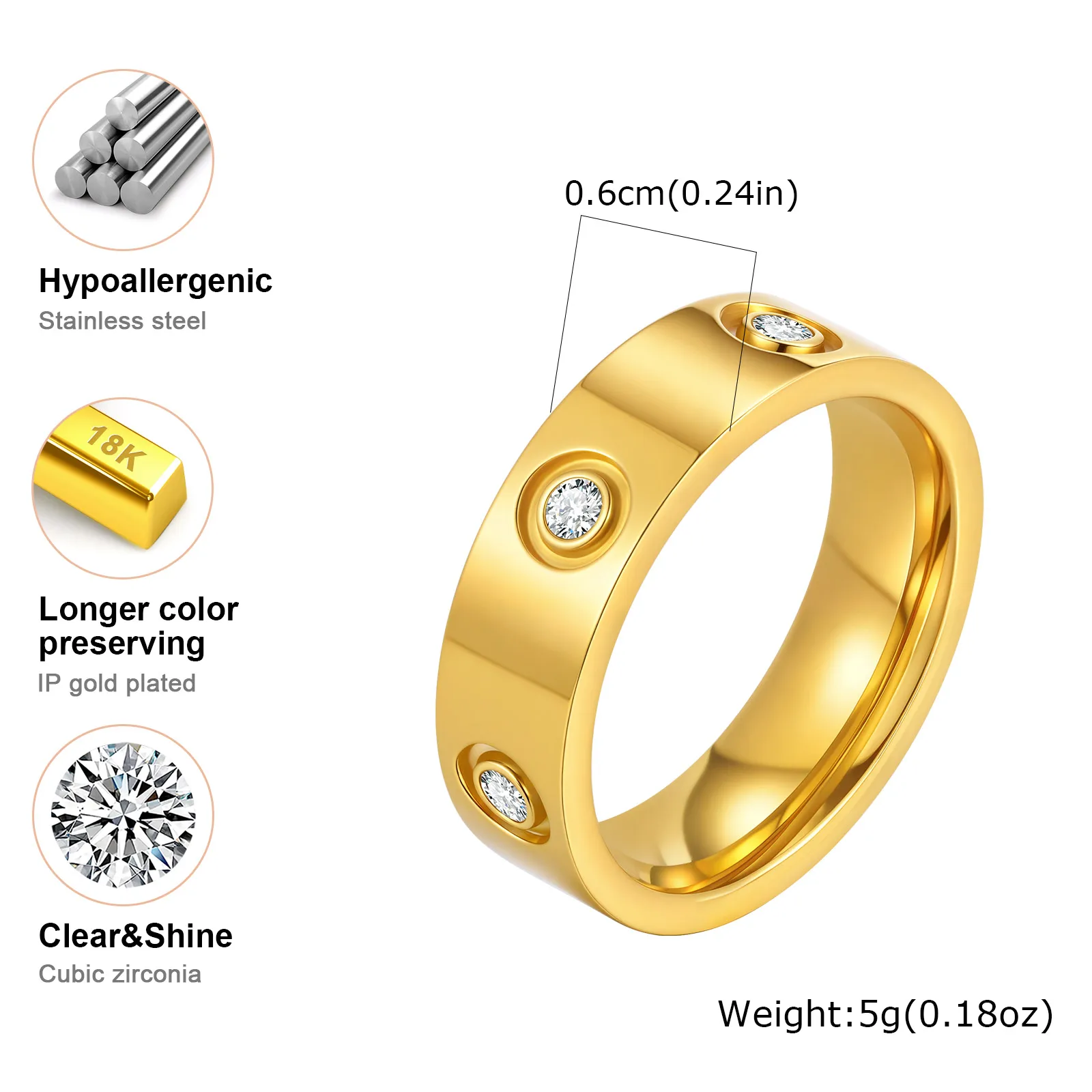 4mm 6mm luxury cubic zirconia stainless steel ring for women men, gold plated chunky waterproof finger jewelry for loved ones size 5-12