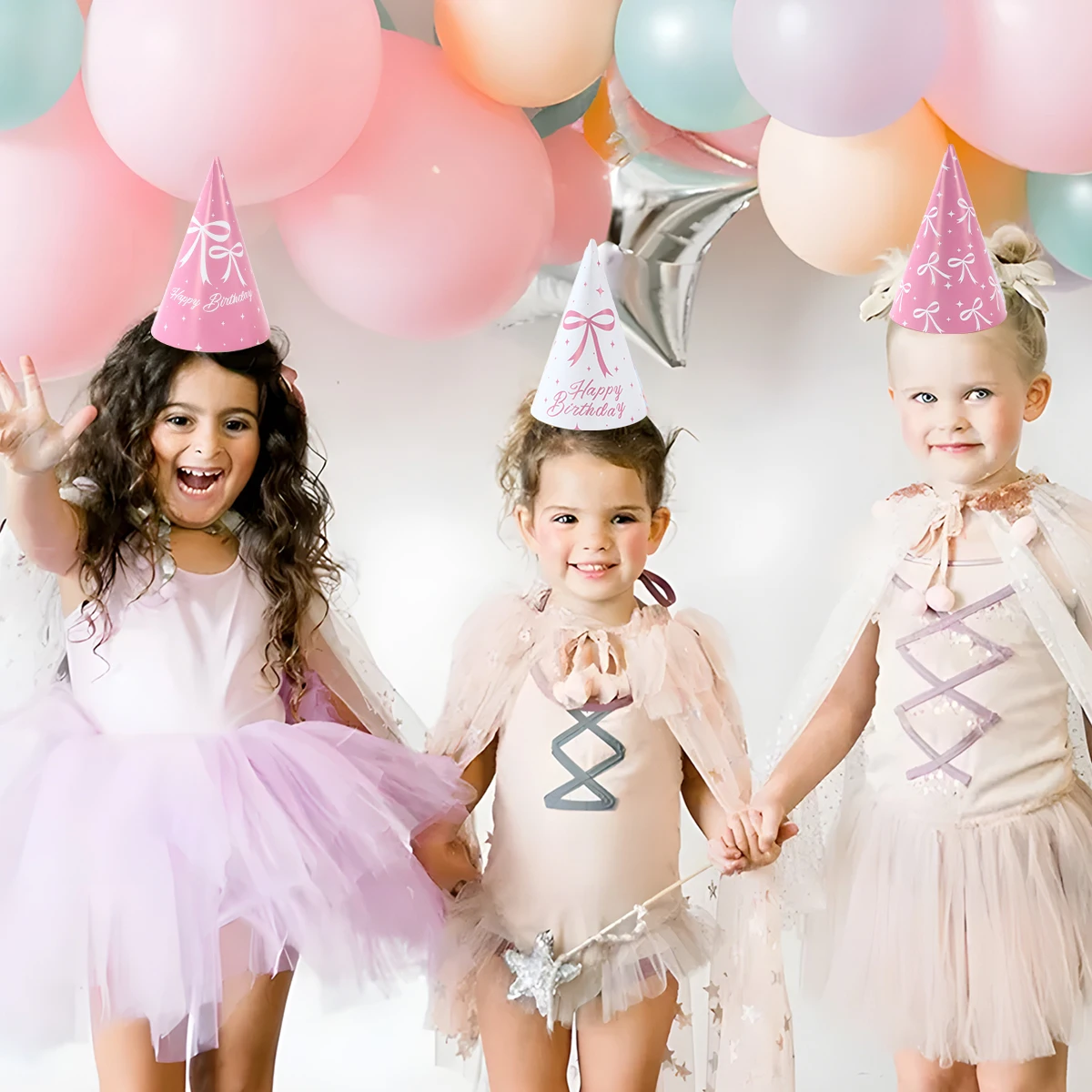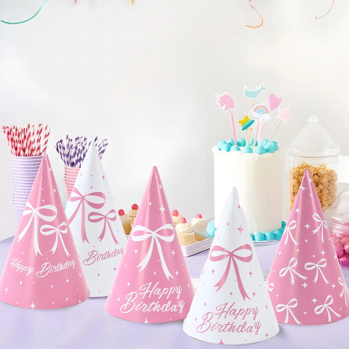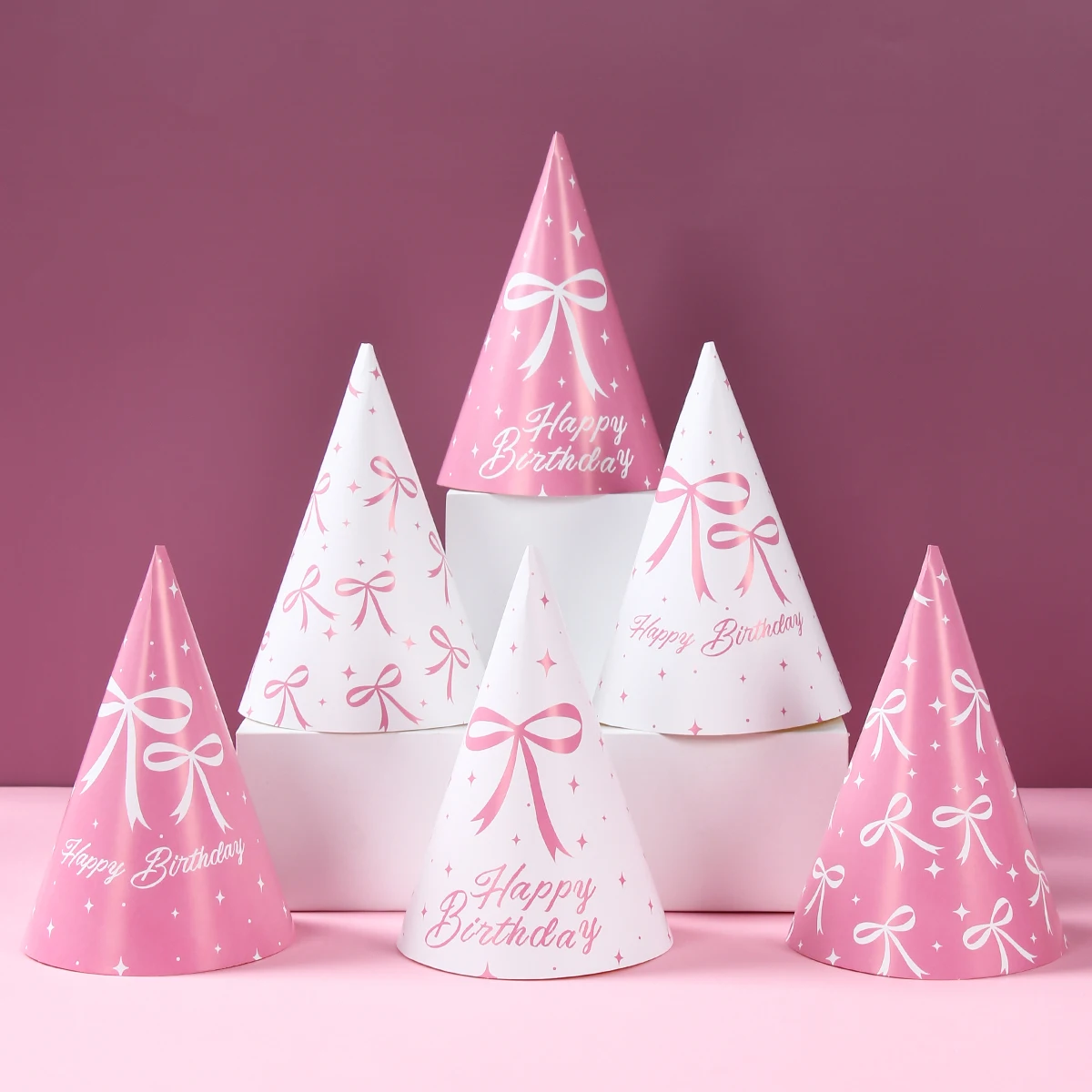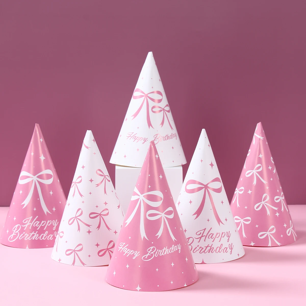 6 pieces of pink and white paper party hats for children's birthday parties in the shape of pink bows to decorate happy birthday parties and baby shower events.
