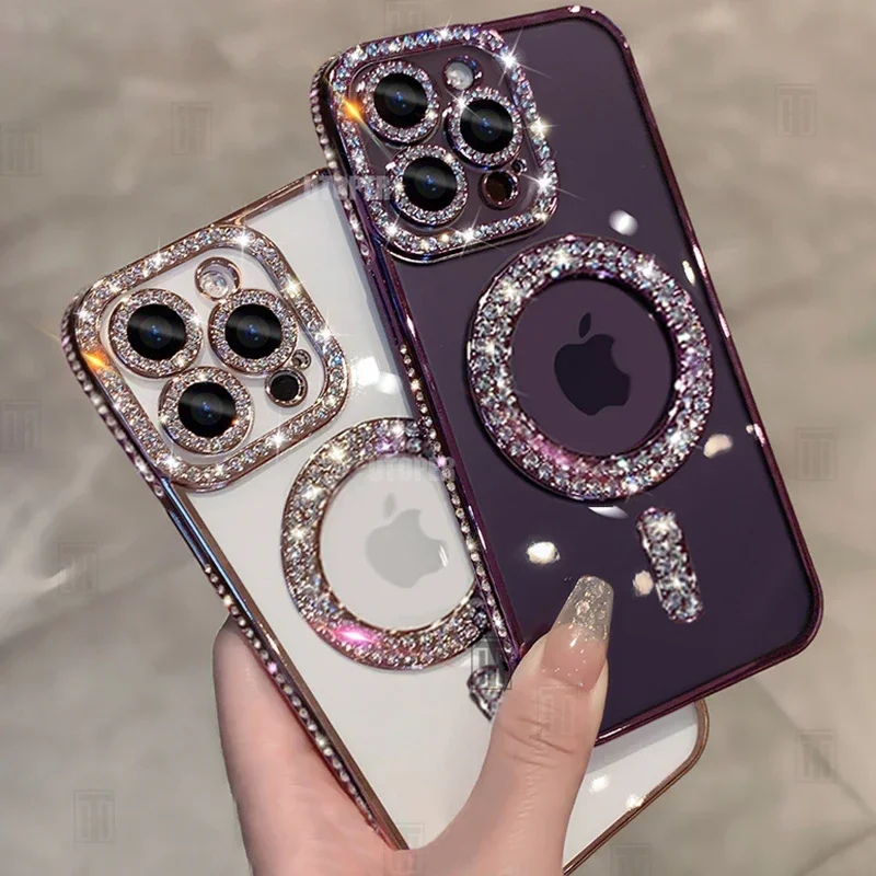High-quality rhinestone glitter iPhone 16 15 11 12 13 14 Pro Max 16 Plus magnetic clear lens protective case