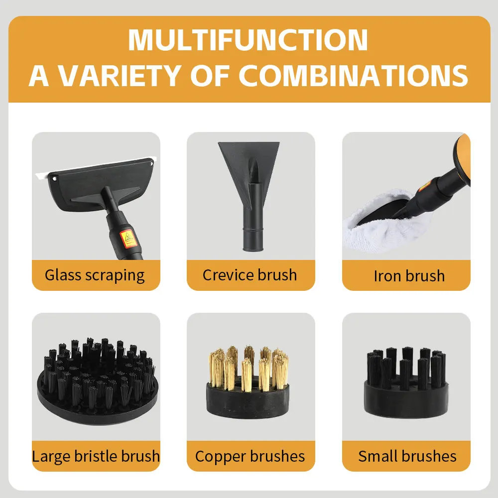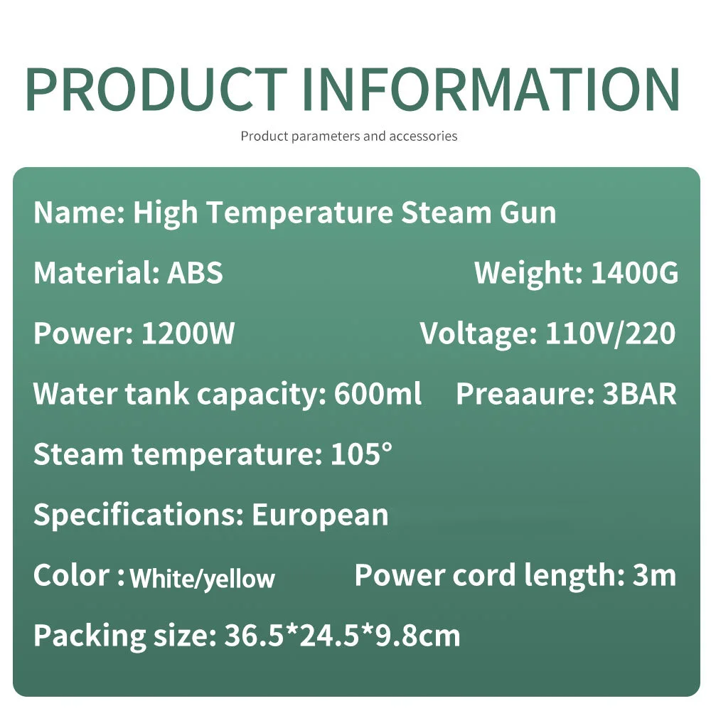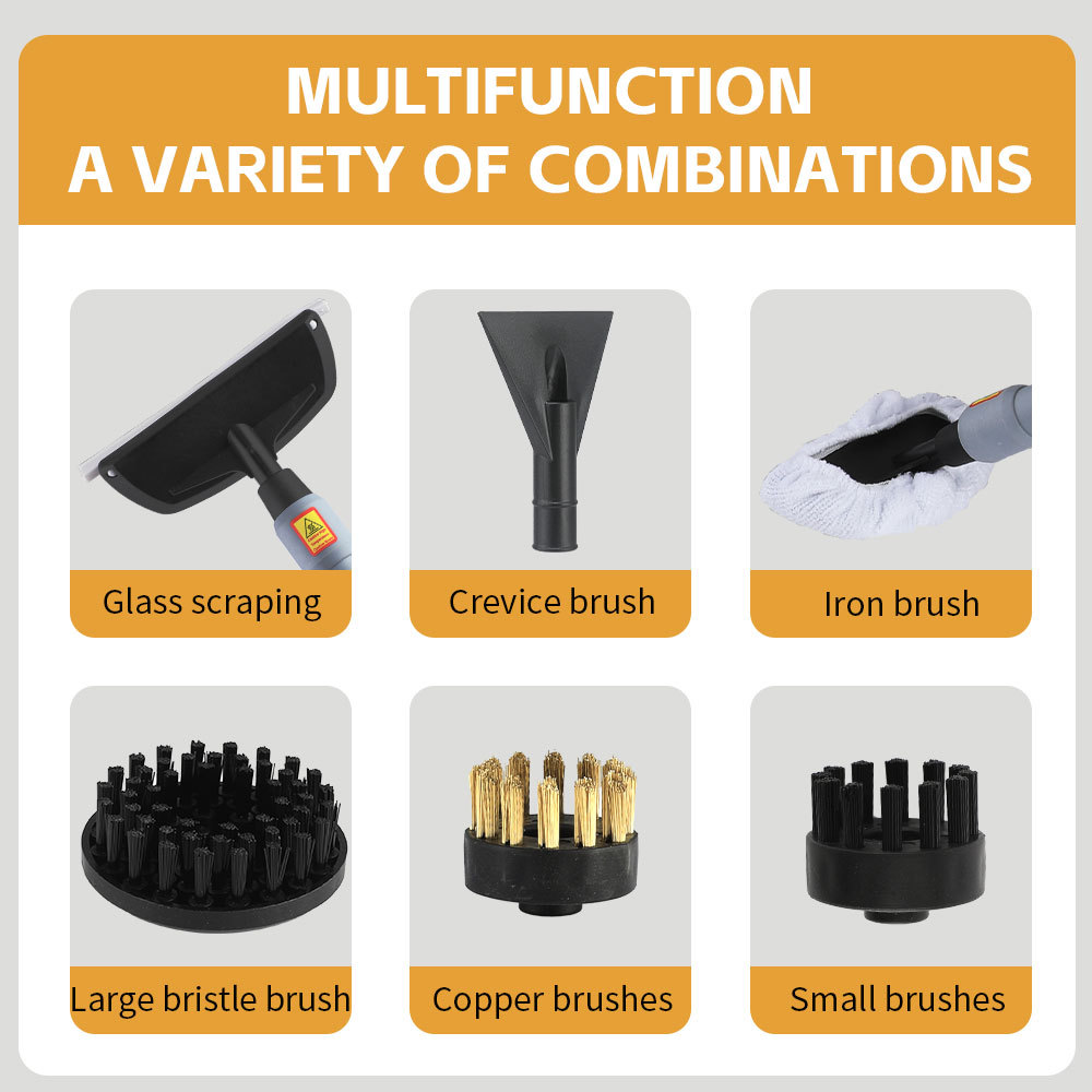 Features: Portable and lightweight design, cleans greasy kitchen corners with high temperature, long-lasting operation without physical and mental strain, electronic digital display accurately shows heating value, three-speed gas output adjustable on demand, high-pressure steam 3BAR, heating in 13 seconds and quick steam spray.