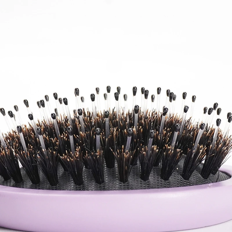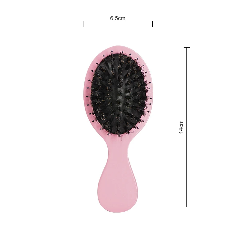 The girl is a cute small pillow hairbrush with a beech wood handle and a detangling hair mixed bristles portable brush for women.