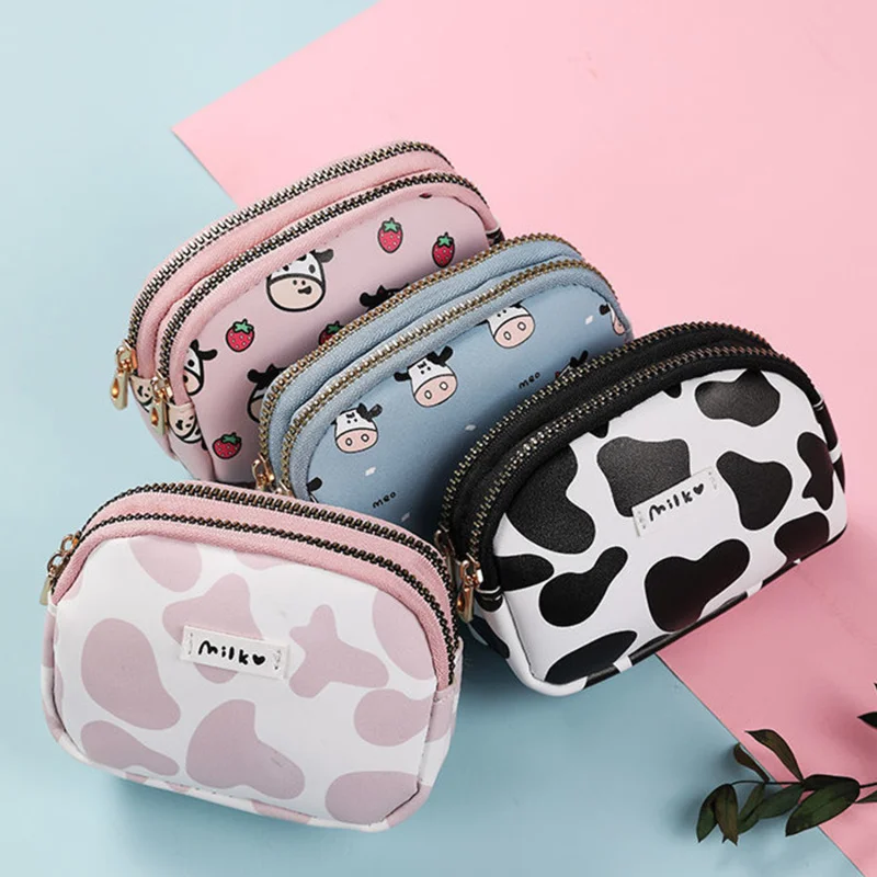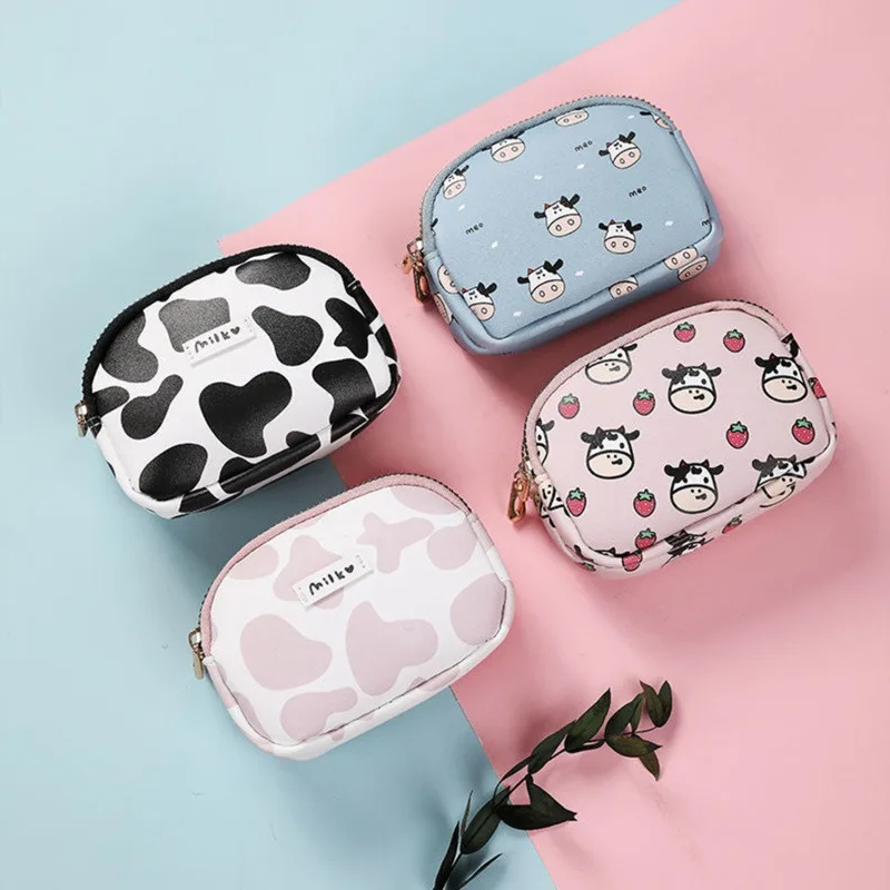 Women Cute Cow Print PU Leather Wallet Card Holder for Business Cards Female Girl Women's Coin Purse Zipper Cartoon Wallet