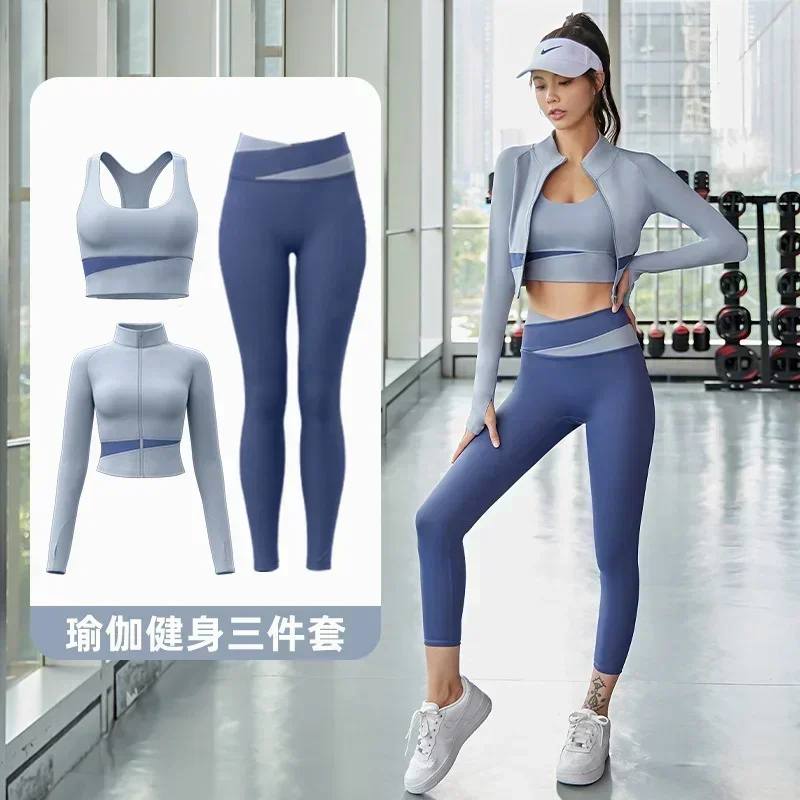 Women Yoga Patchwork 3 Piece Fitness Gym Set Jackets + Leggings Workout Running Sportswear Sports Outfit
