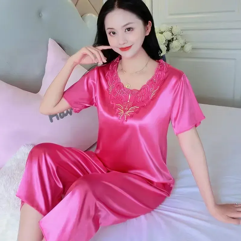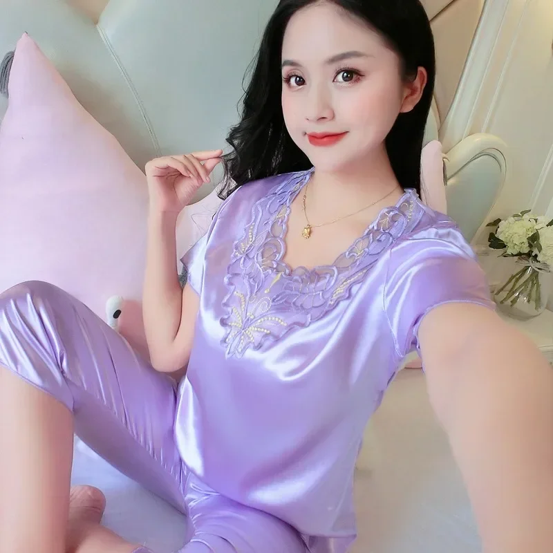 Summer women's short sleeve V-neck pajama set plus size lace home clothing imitation silk sleep pants special outfit M-3XL
