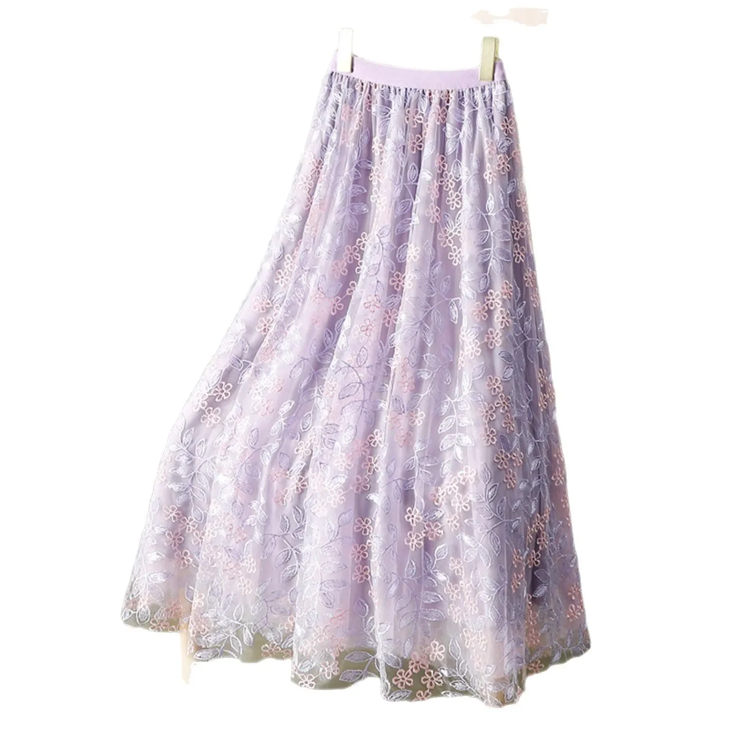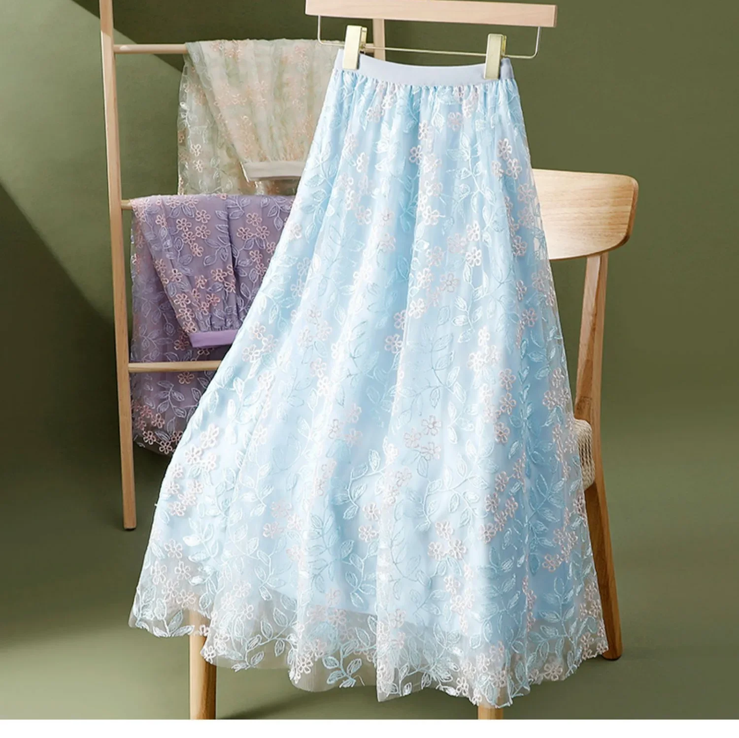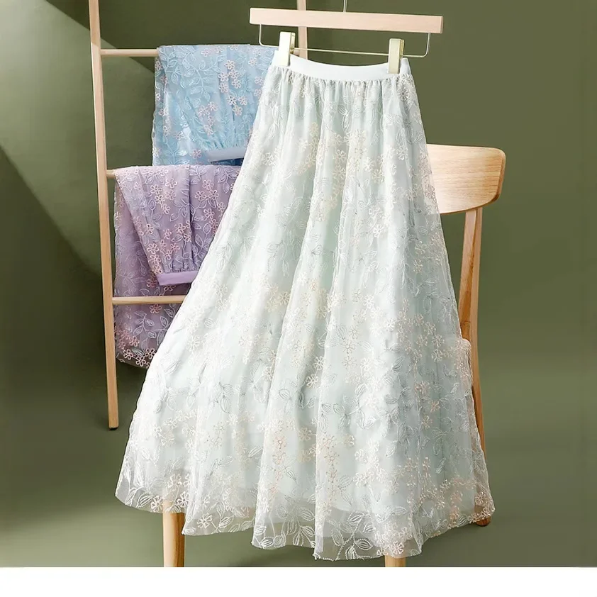 Elegant embroidered floral sheer half skirt A-line midi umbrella skirt for women summer slimming big hemline polyester fibers.