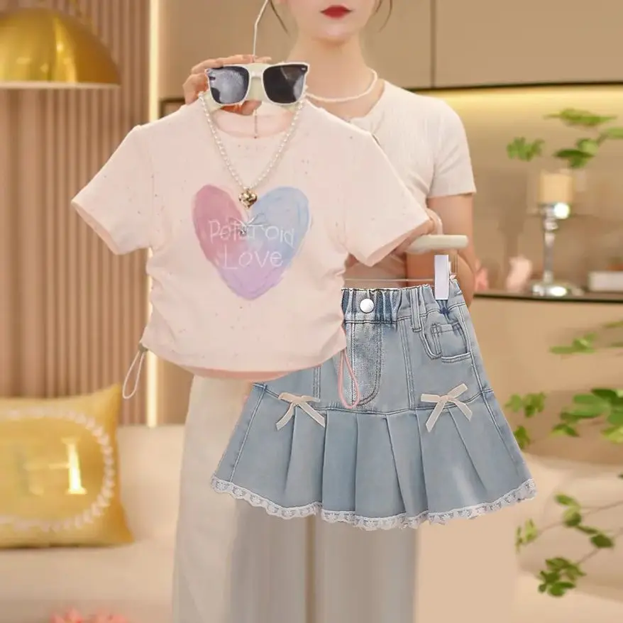 New cute summer outfits for little girls, letter tops + denim skirts princess fashion sets.