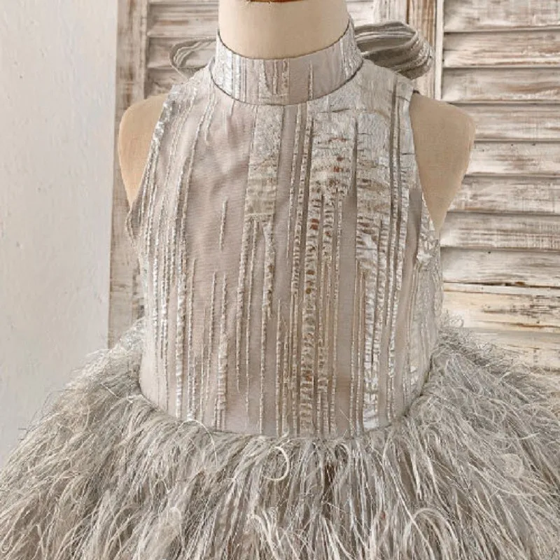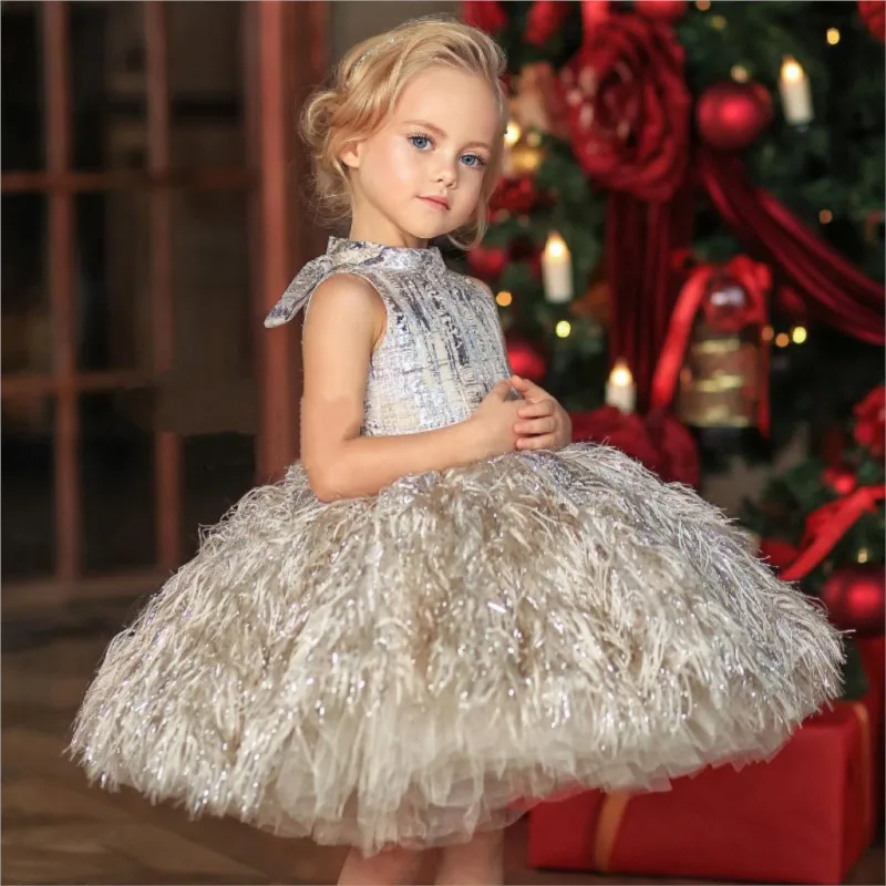Elegant dress for little girls, princess style, sleeveless feather dress for infants, vintage dress for birthday parties from 1 to 12 years old.