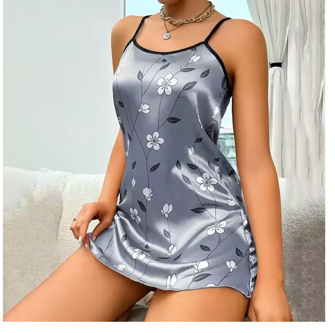 Women's satin nightgown printed with flowers, comfortable nightgown with spaghetti straps, luxurious satin sleepwear, easy to wear nightgown.