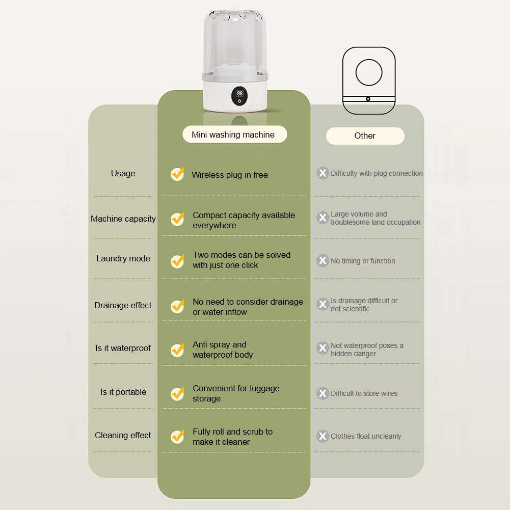 1. Integrated and portable:The small wireless and rechargeable portable washing machine is designed for on-the-go use, making it suitable for children's clothes, underwear, camping, or traveling in recreational vehicles. Its lightweight and portable design ensures that you can maintain cleanliness and freshness wherever your adventures take you.