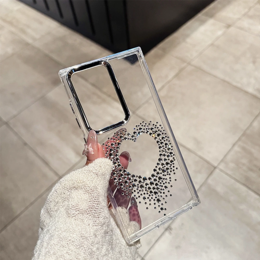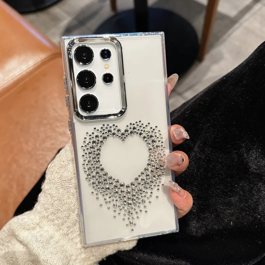 Luxury diamond case for Samsung S25 Ultra for women and girls, love heart cover for Samsung Galaxy S24 S23 S22, ultra-clear polyurethane case.