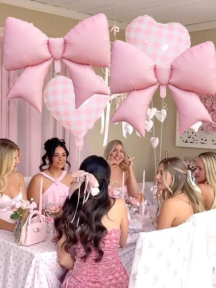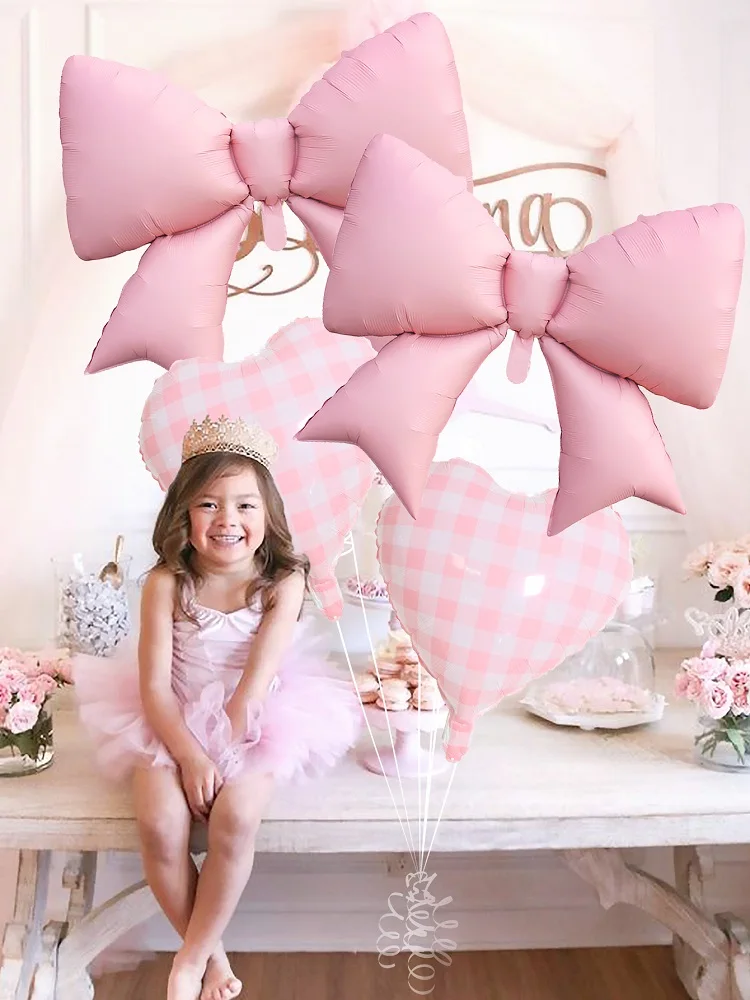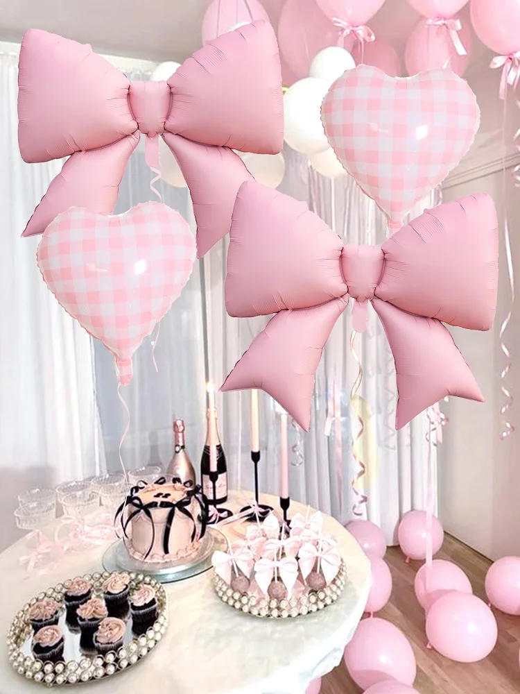 A set of pink bow-shaped balloons and a patterned heart, including a large butterfly knot, a new helium foil balloon in the shape of a pink heart for cocktail birthday decorations, wedding gifts, weddings, engagements, anniversaries, Valentine's Day, single party decor, baby showers, girls' birthday parties, princess parties, tea party decor, indoor background decor.