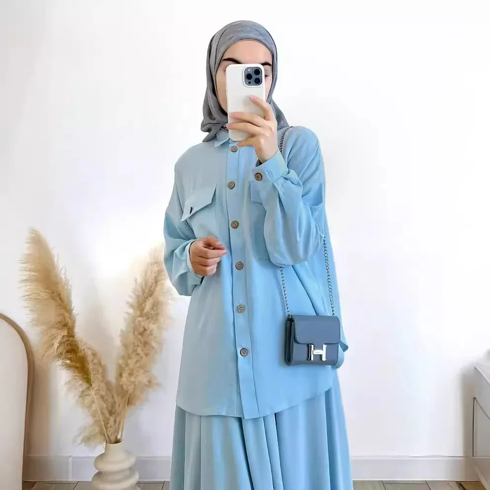 Two-piece long-sleeve shirt and skirt set for women, elegant Dubai Turkey abaya, casual Islamic upper clothing, solid color skirt, fashion.