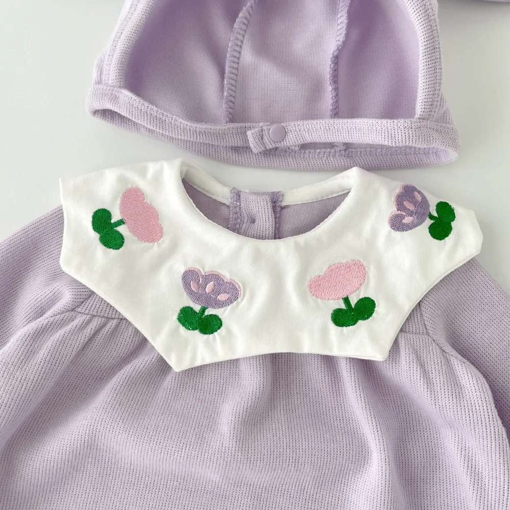 2.**عناصر تصميم ساحرة**: يضيف طوق الدمية المطرز بالزهور الرقيقة لمسة رائعة وأنيقة.توفر الأكمام الطويلة الدفء، بينما يسمح تصميم الرومبير المثلث بتغيير الحفاضات بسهولة.
