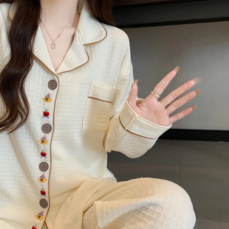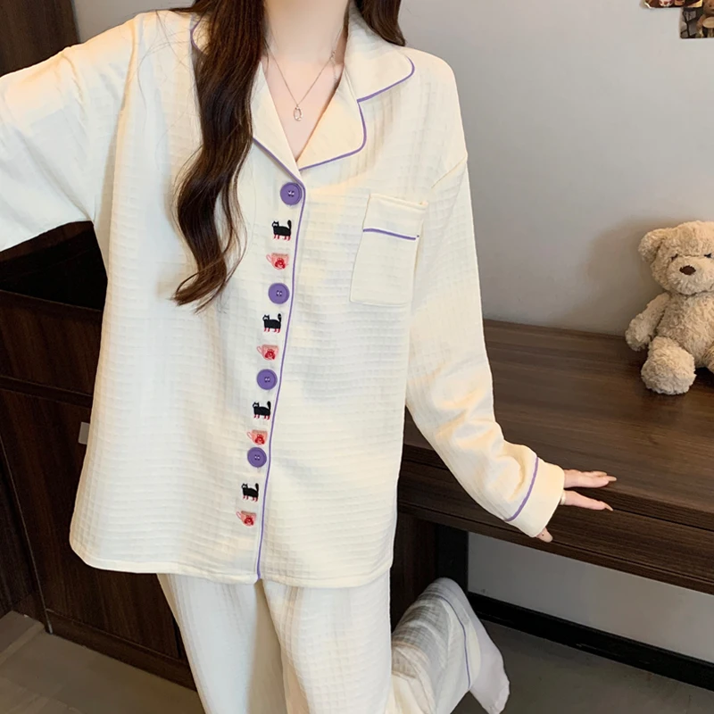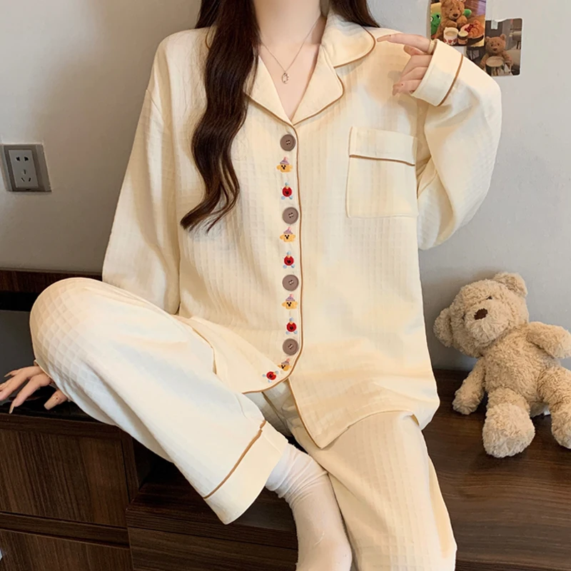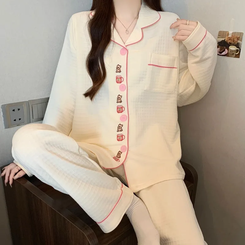 2 قطعة/المجموعة النساء أزياء طويلة الأكمام منامة الخريف الشتاء التطريز لطيف لينة المرأة منامة مجموعة عارضة الكورية ملابس منزلية جديدة