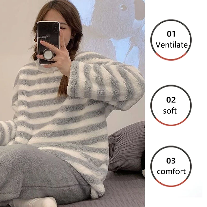 2 قطعة/المجموعة مبطن سميكة الدافئة الخريف الشتاء طويلة الأكمام لينة منامة النساء المرجان الفانيلا خارج مخطط الفانيلا Homewear كبيرة