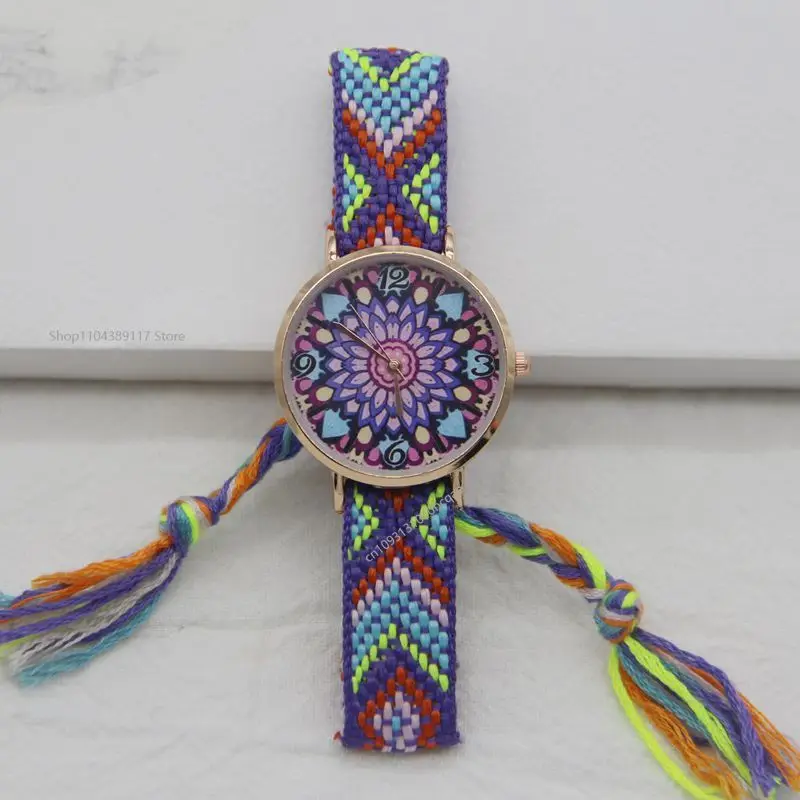 البوهيمي السيدات سوار ساعة المنسوجة قوس قزح حزام الأزهار طباعة الهاتفي التناظرية ساعة كوارتز فتاة هدية