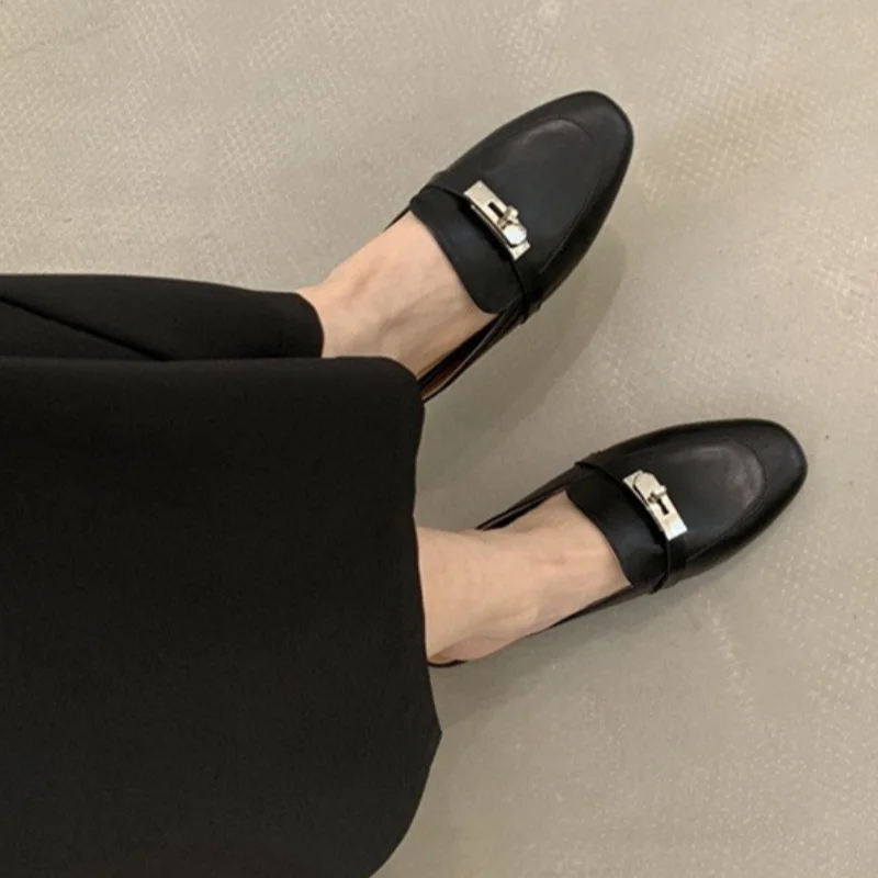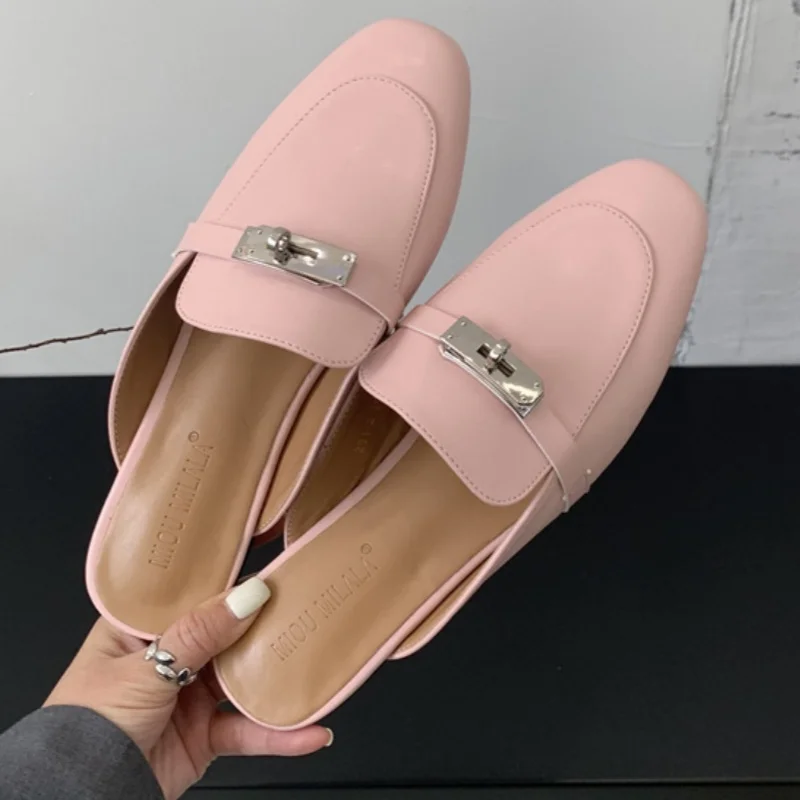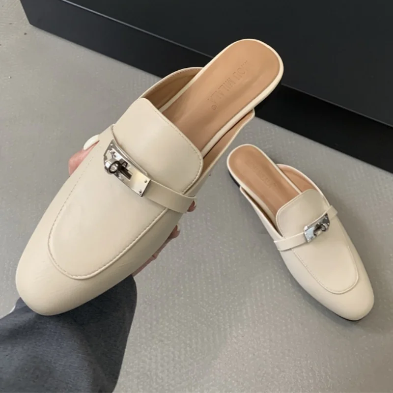 2025 صيف خريف جديد المرأة جلدية مريحة الانزلاق على النعال اليومية زخرفة المعادن عادية خارج الصنادل الإناث