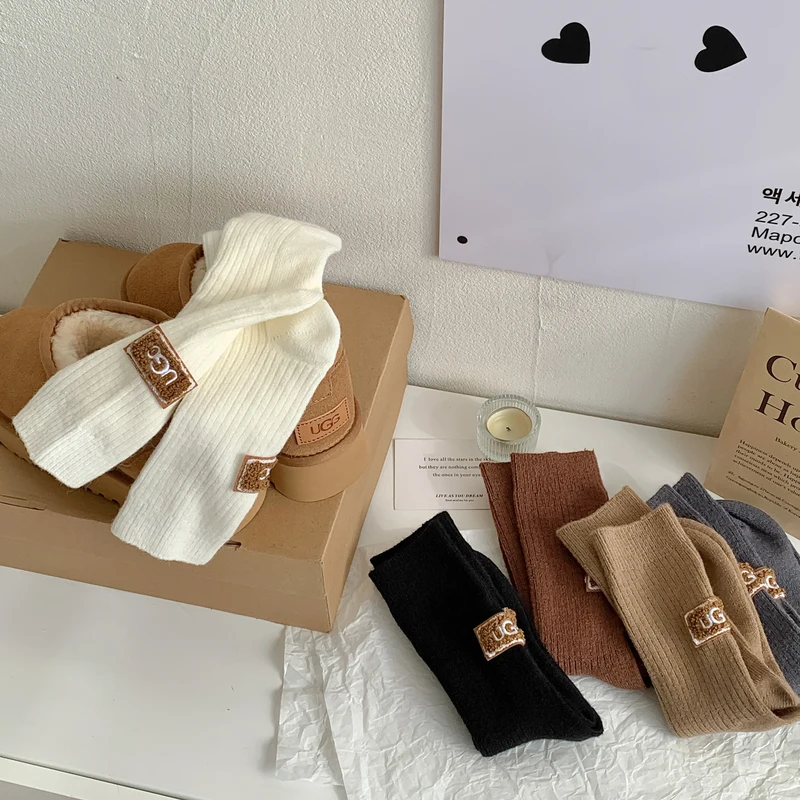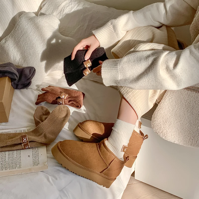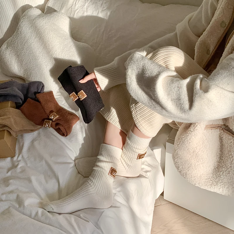 3 أزواج الشتاء الجوارب النسائية الصوف الكشمير الصلبة الدافئة سميكة كومة الجوارب المطرزة شعار منتصف العجل الجوارب حذاء الثلوج عادية جورب