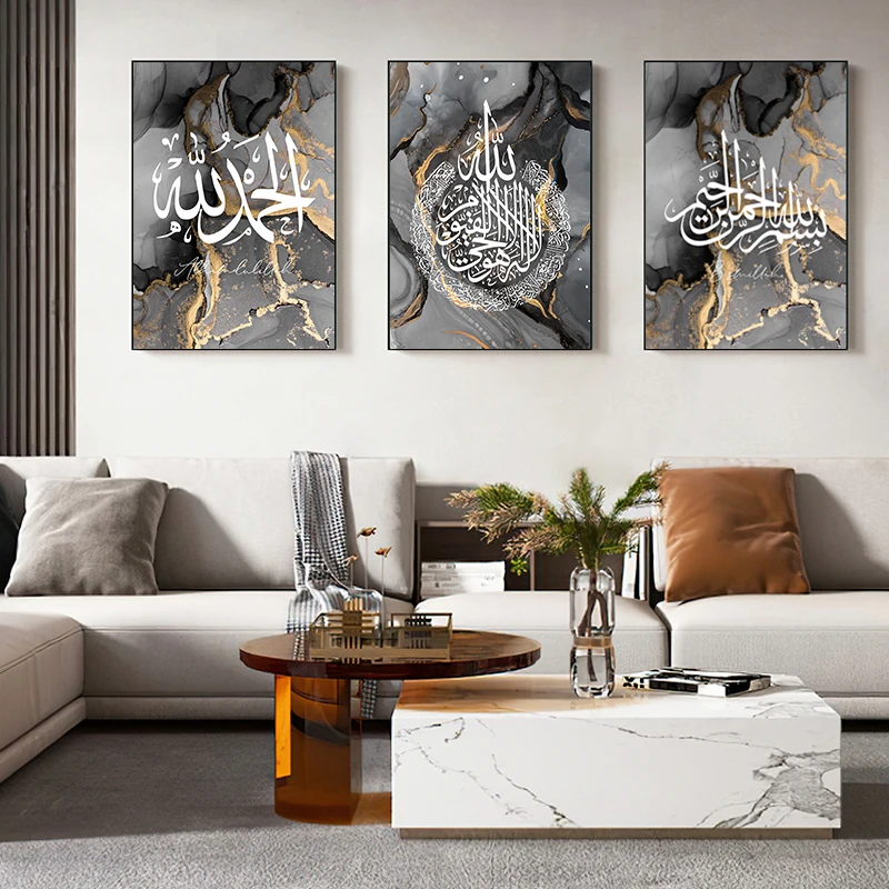 3 قطعة/المجموعة الذهب الأسود الرخام قماش اللوحة الخط الإسلامي المشارك يطبع Ayatul القرآن الله جدار صور غرفة المعيشة ديكور