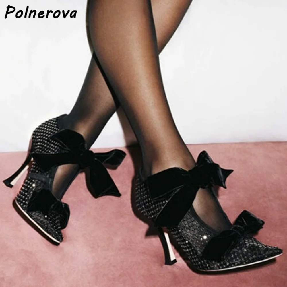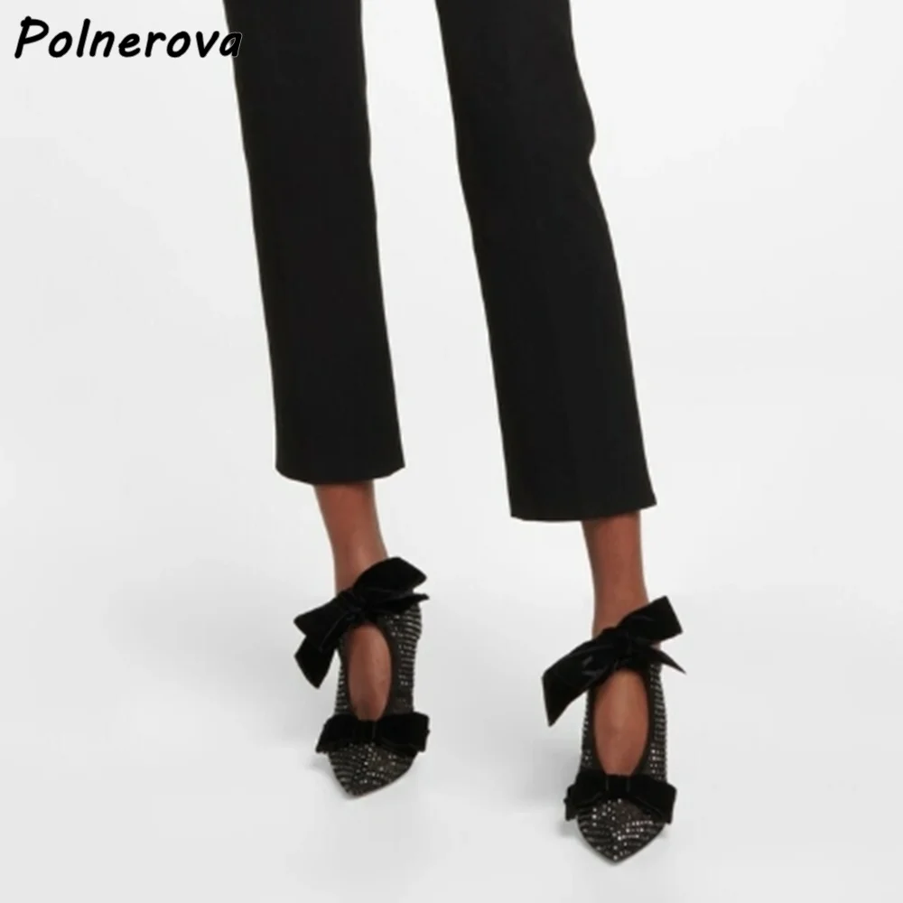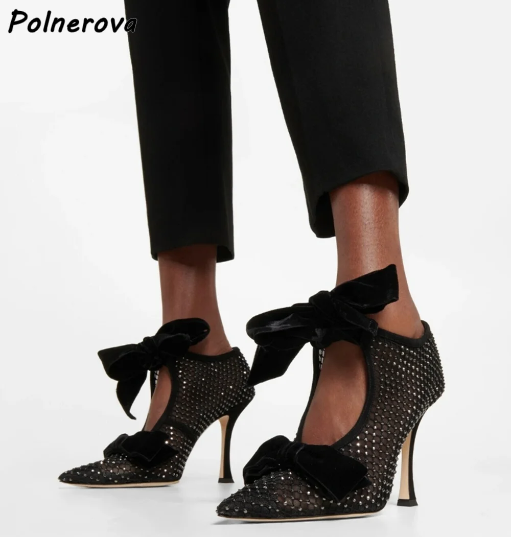 الهواء شبكة حجر الراين فراشة عقدة مضخات الجوف الأسود رقيقة الكعوب مدبب تو كريستال أحذية فاخرة المرأة مثير خنجر مضخات