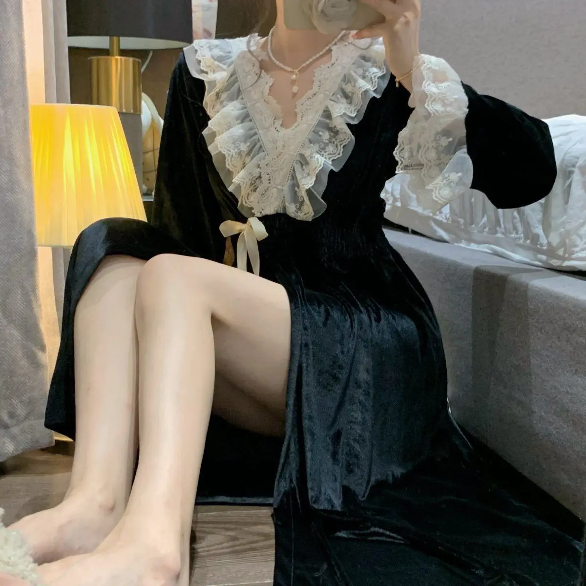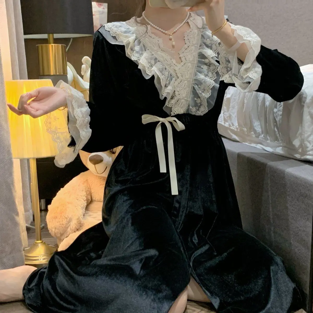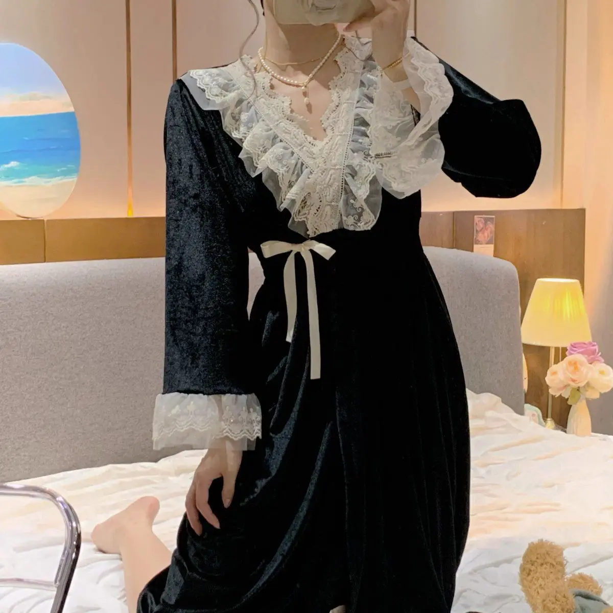 الخريف الشتاء طويلة الأكمام منامة للنساء الكورية نمط لطيف الأميرة نمط الخامس الرقبة الدانتيل منتصف طول ثوب النوم بيجامة فتاة سيدة