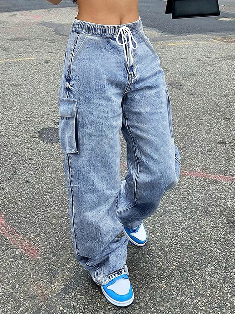 المرأة الدنيم البضائع السراويل فضفاضة الرباط مطاطا الخصر جيوب عادية مستقيم واسعة الساق السراويل الملابس النسائية TC70235