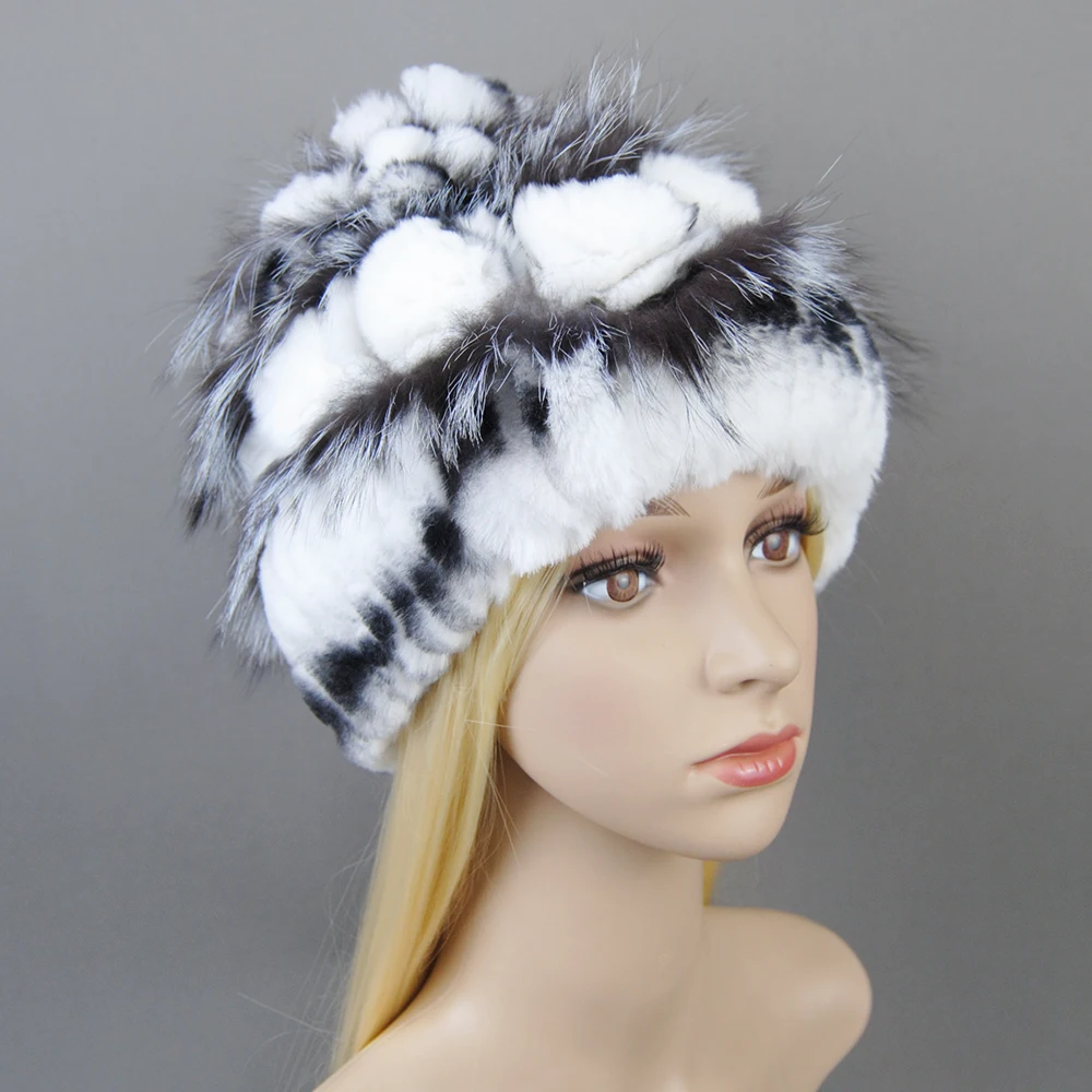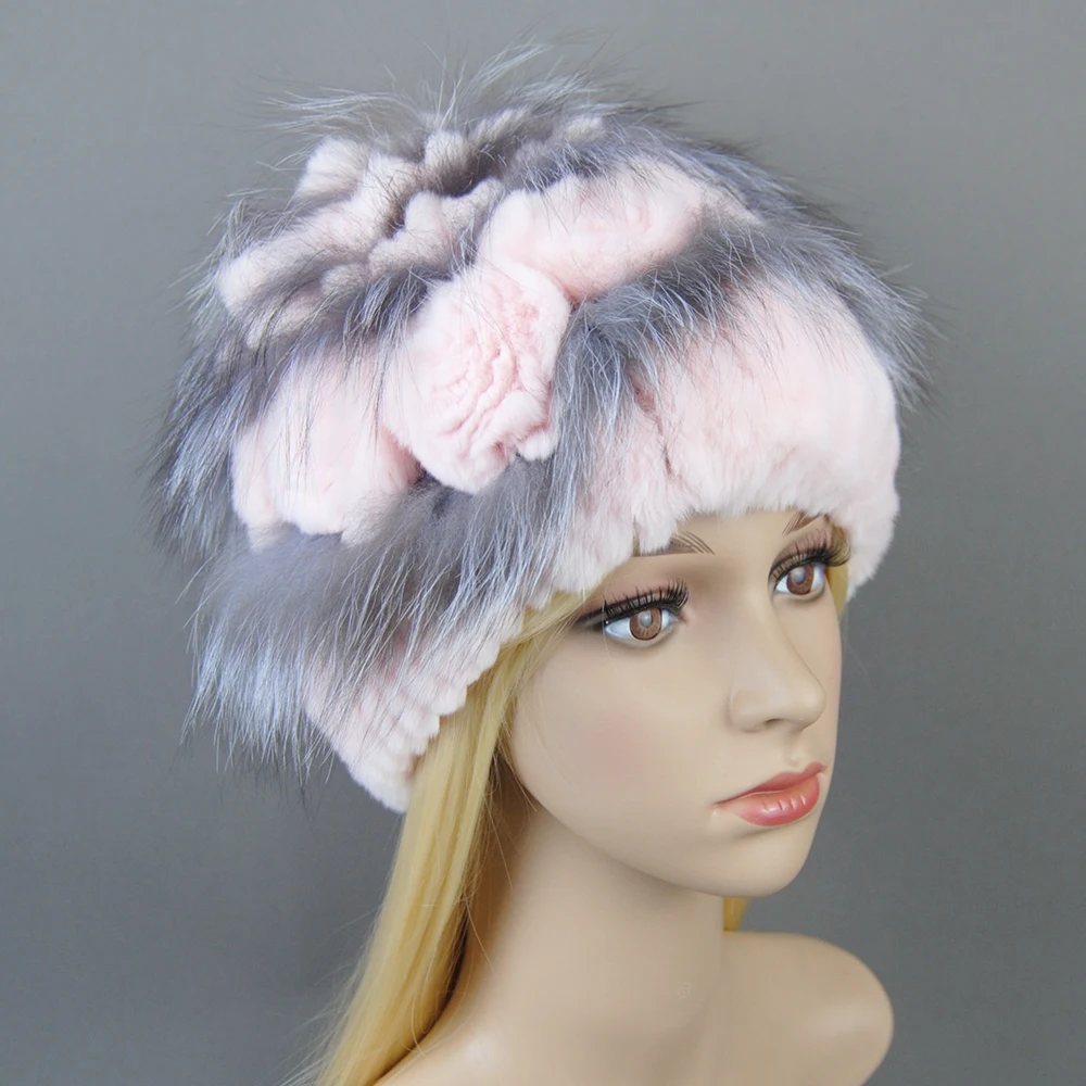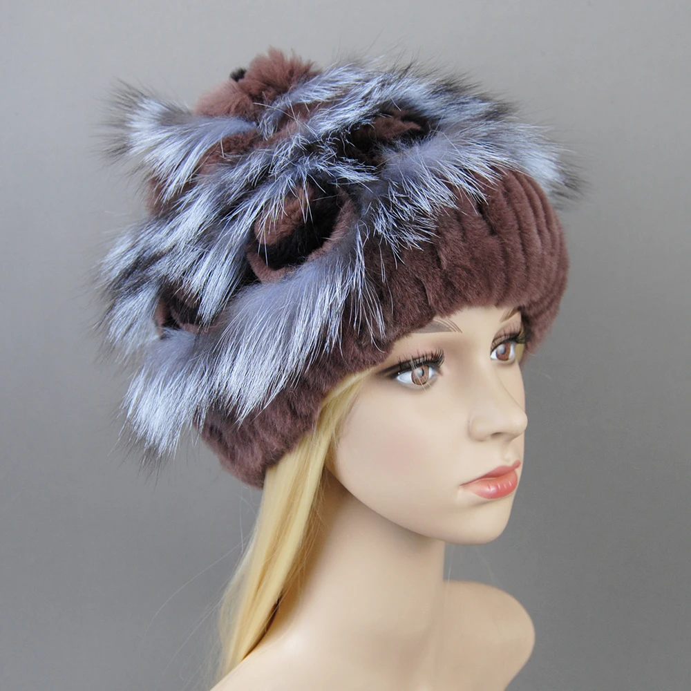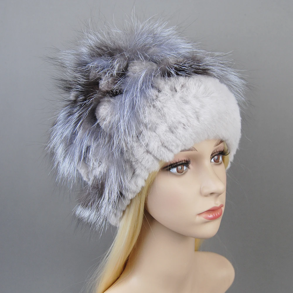 المرأة الشتاء الفراء قبعة الفراء الطبيعي محبوك ريال ريكس الأرنب الفراء القبعات نمط جديد فاخر المرأة الشتاء الفضة الثعلب الفراء قبعة بيني