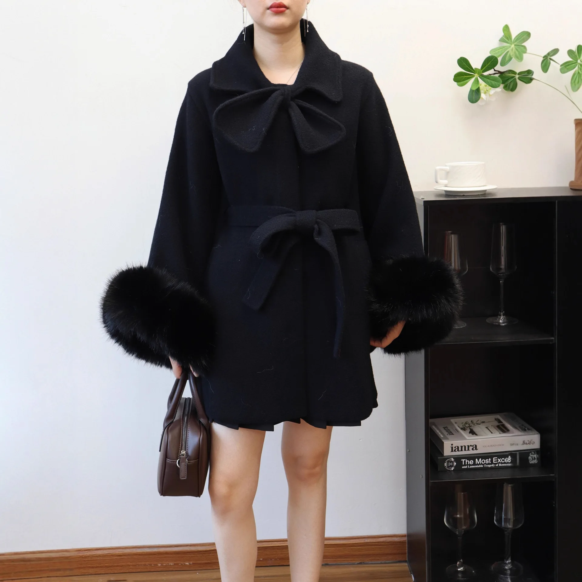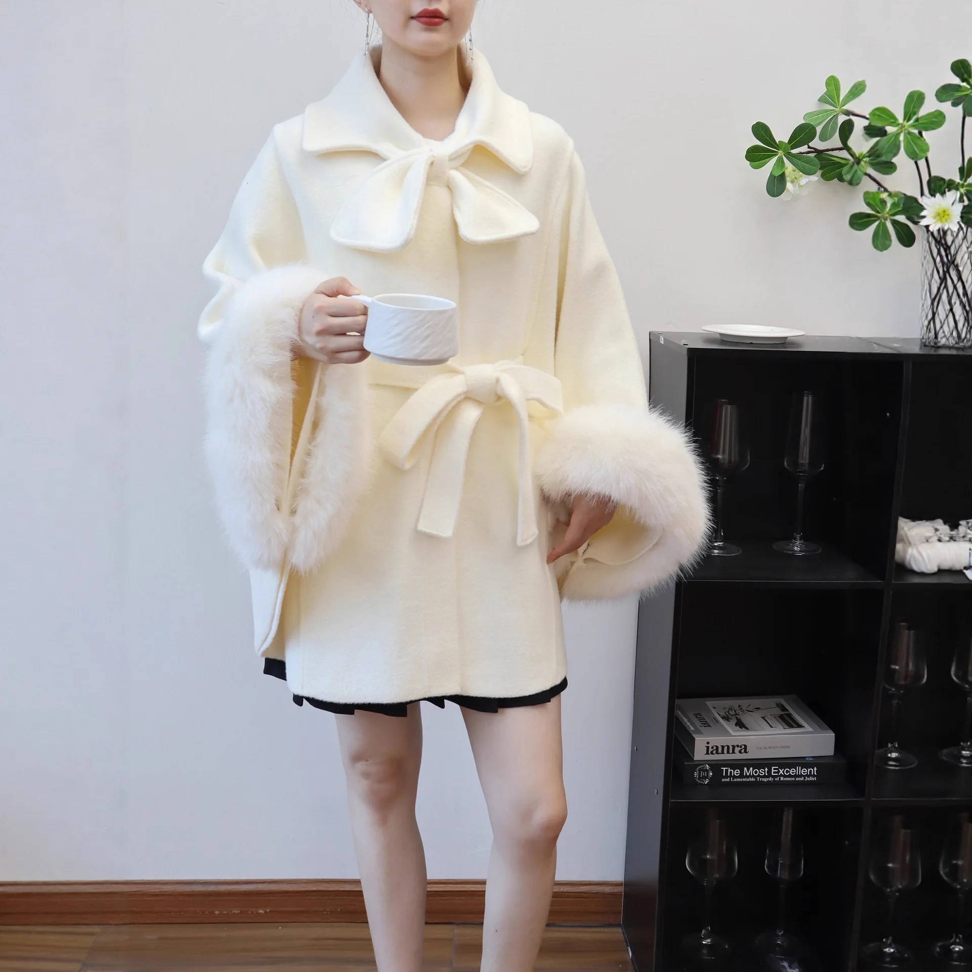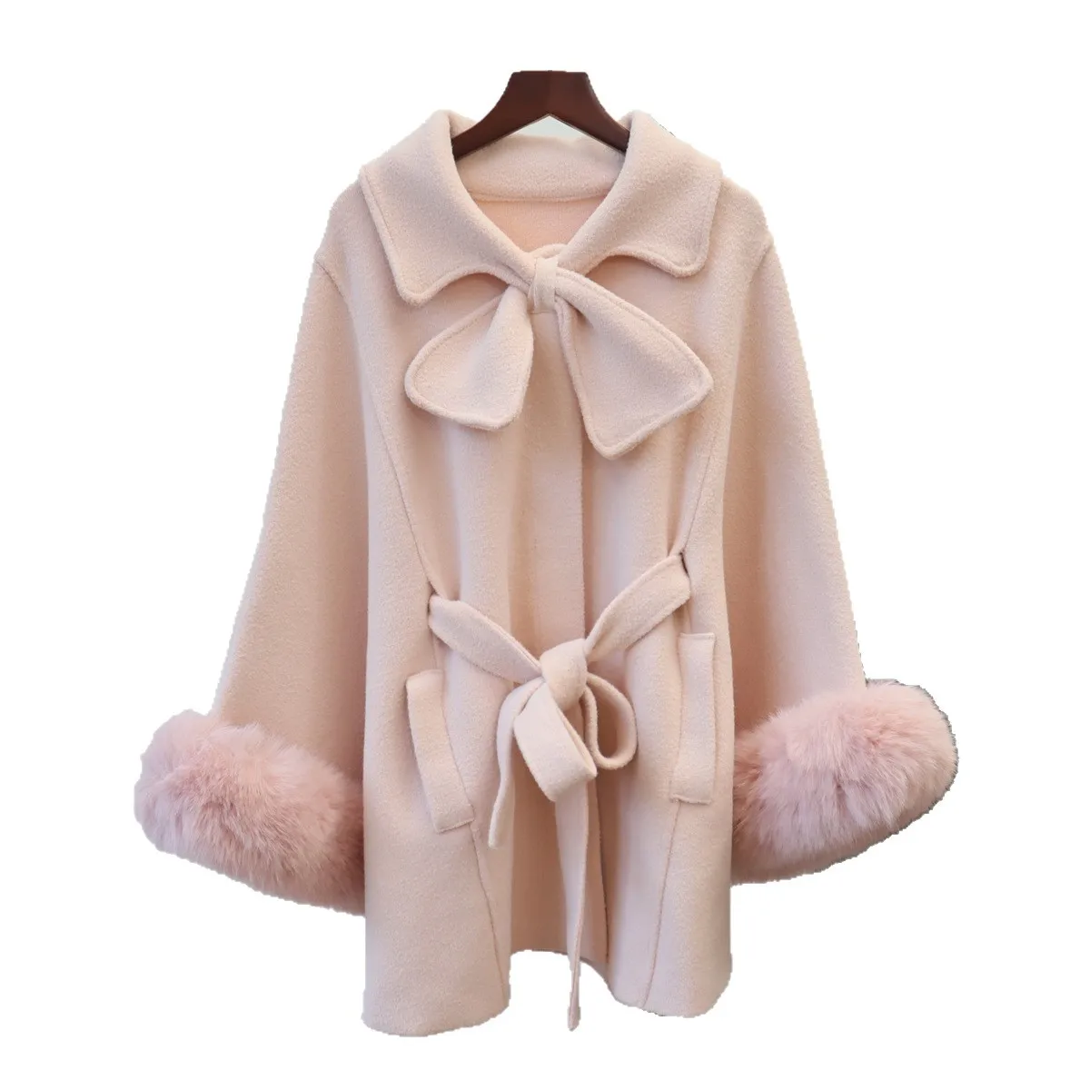 النساء عباءة معاطف الصوف كيب معاطف الصلبة الفراء الكفة الدانتيل يصل الخصر القوس رفض طوق فضفاض أنيق عادية الخريف الشتاء