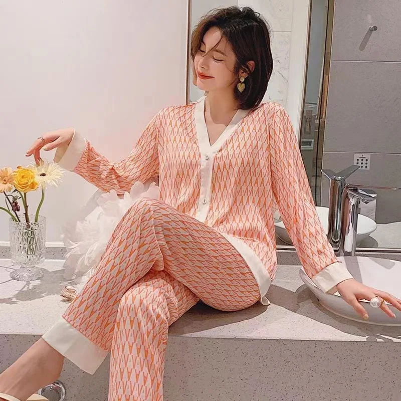 الربيع والصيف جديد بيجامة من الحرير الجليدي مجموعة الفتيات طويلة الأكمام الخامس الرقبة سترة محاكاة الحرير التلبيب منامة