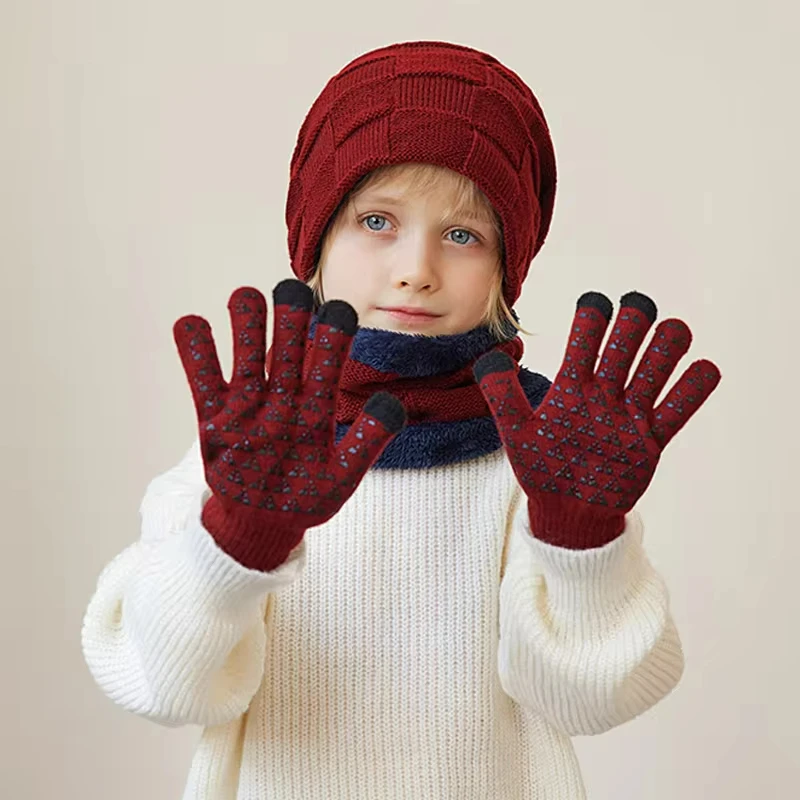 الشتاء الأطفال قبعة قفازات وشاح مجموعة الرقبة أدفأ الأوشحة خمسة أصابع قفازات زائد المخملية قبعات منسوجة للأطفال الأولاد اكسسوارات