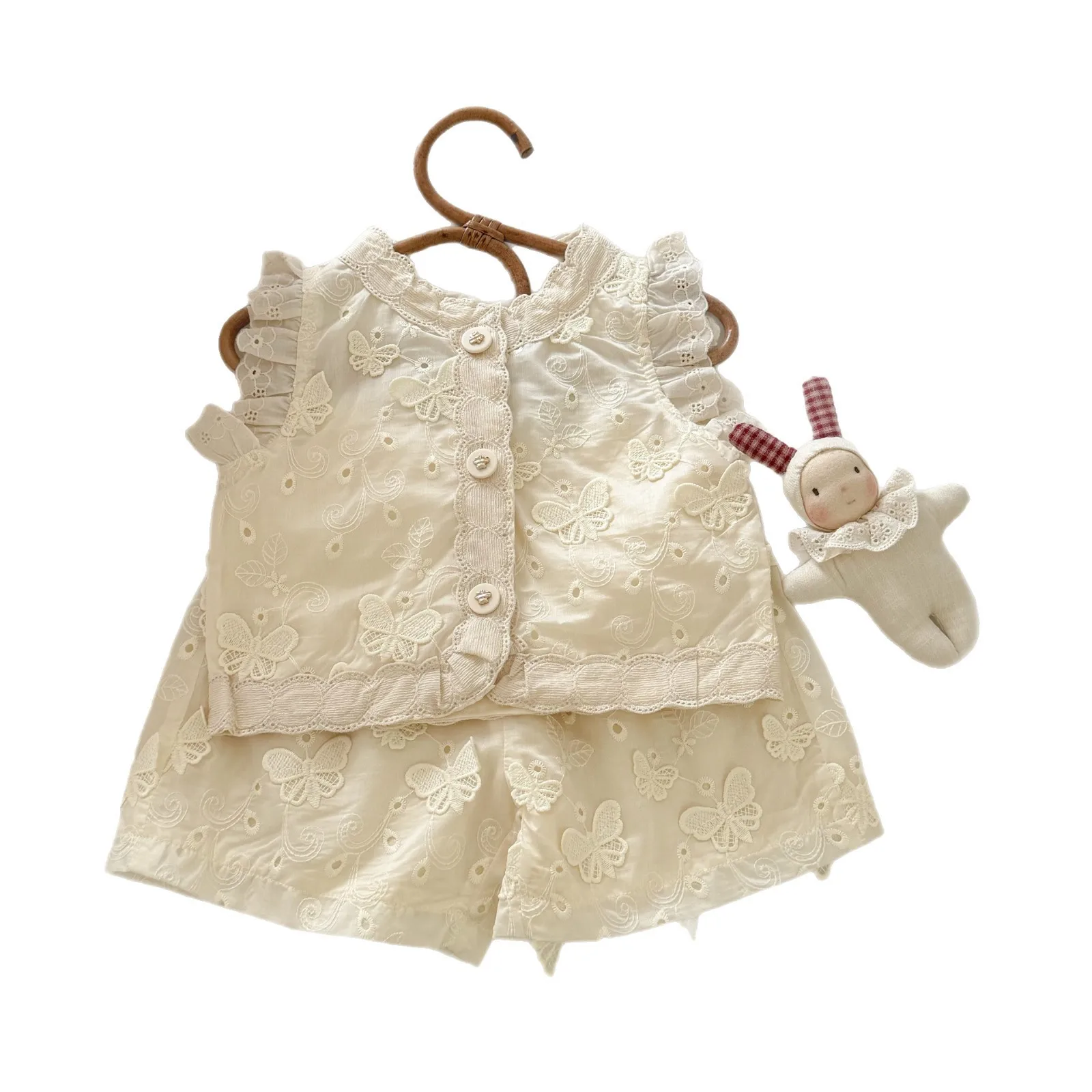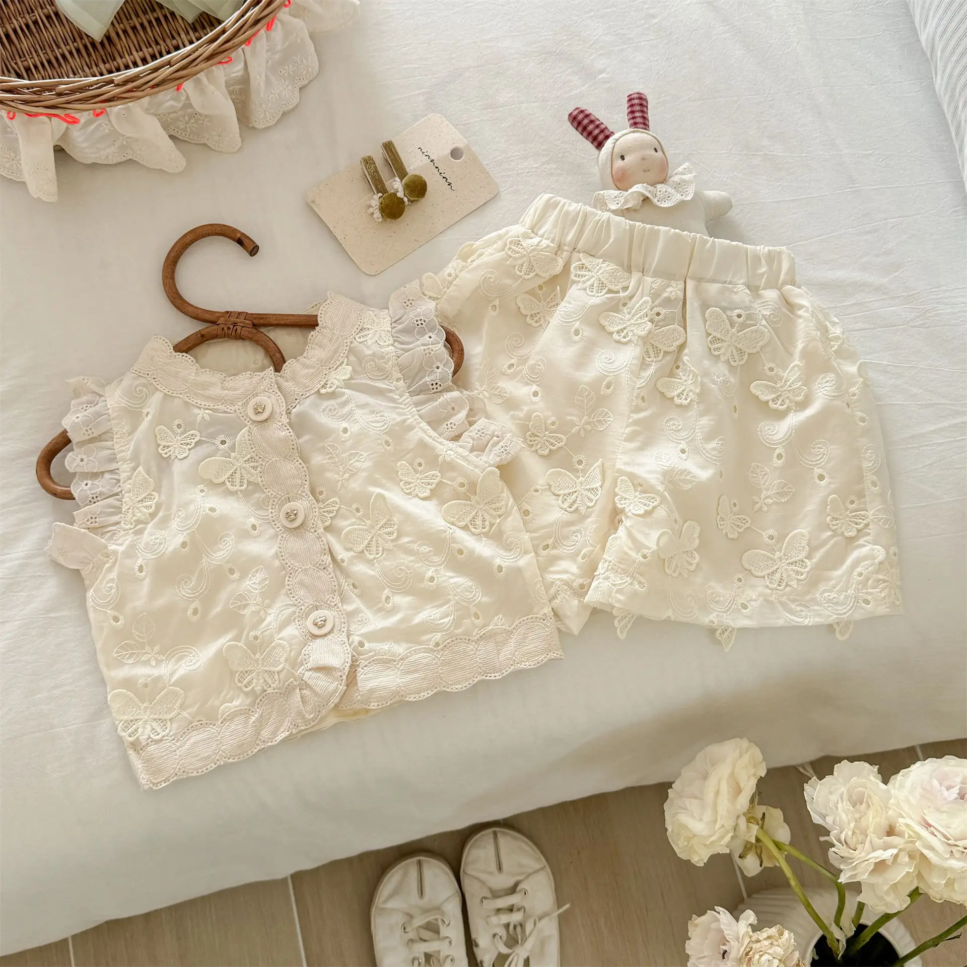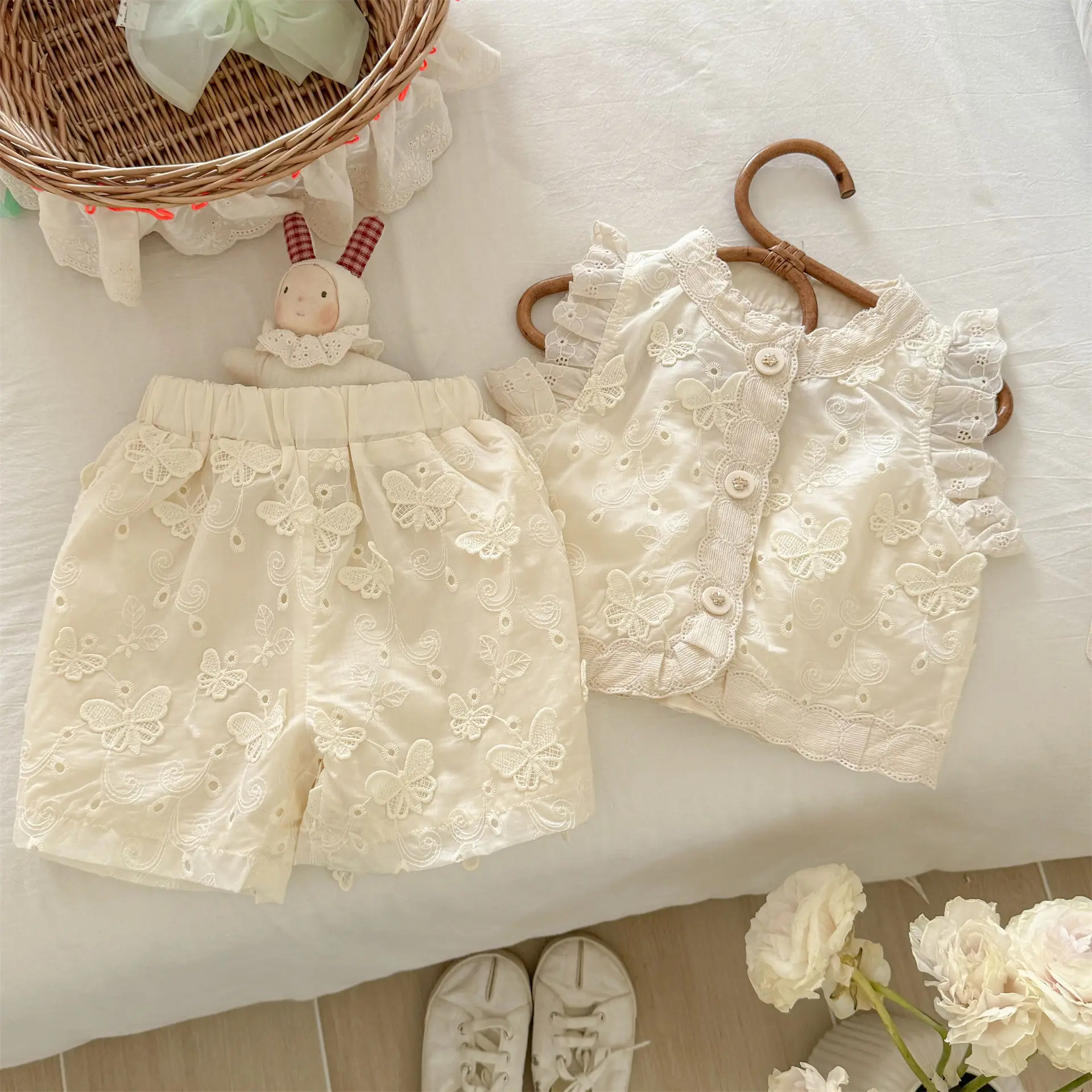 الصيف الأطفال الفتيات 2 قطعة مجموعة الملابس المطرزة الدانتيل طوق بلا أكمام بلايز أنيق فراشة السراويل دعوى طفل الفتيات الزي