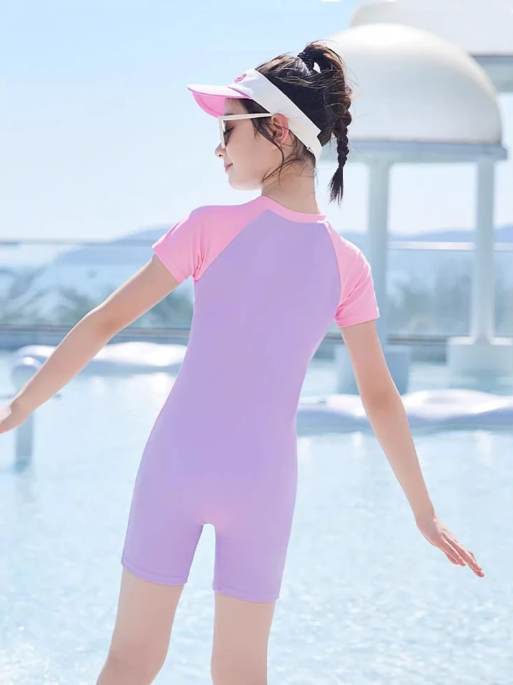بدلة سباحة بسحاب أمامي من قطعة واحدة للفتيات ملابس سباحة للأطفال بأكمام قصيرة نمط ملابس بحر مقاس كبير