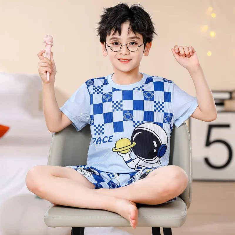 بيجامه حرير ثلجي للفتيان والفتيات ، شرائط حفرة قطنية ، روب بأكمام قصيرة ، أم الأطفال ، النسخة الكورية ، الصيف