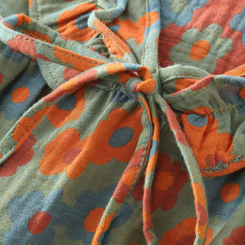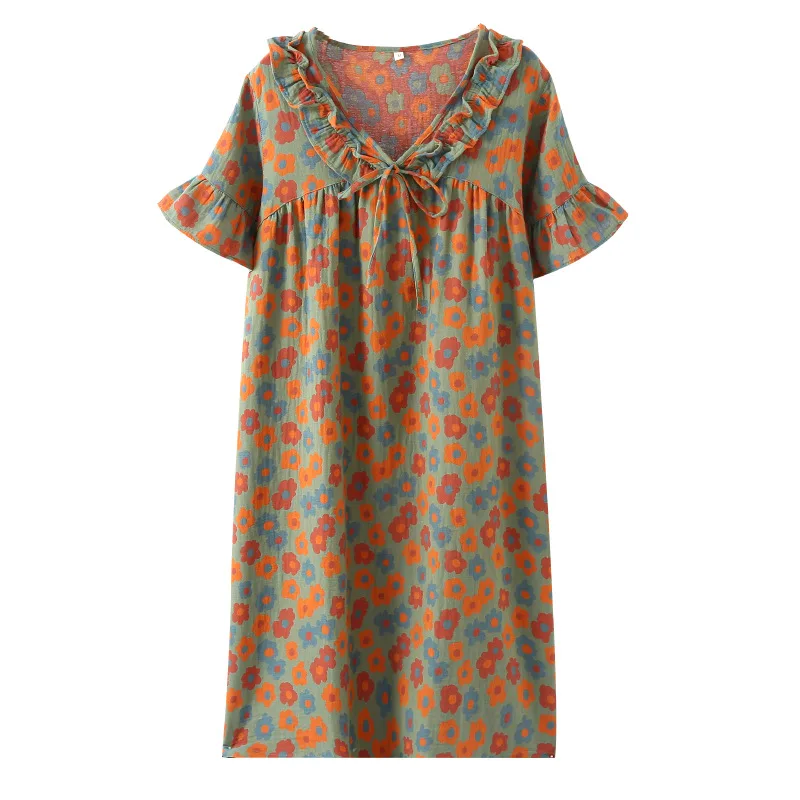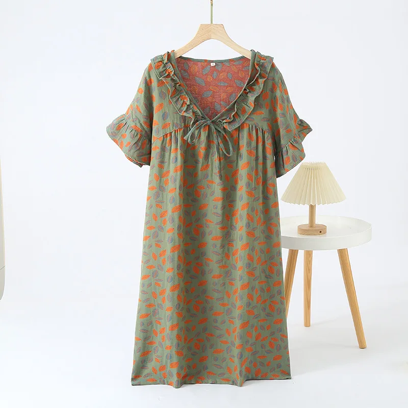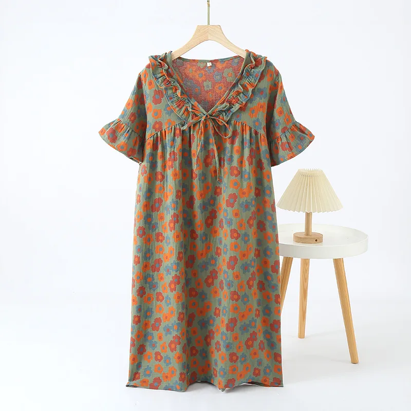 فستان بيجامة من القطن الخالص بأكمام قصيرة للنساء من قماش الجاكار المصبوغ قطعة واحدة ملابس نوم بأكمام قصيرة ثوب نوم فضفاض