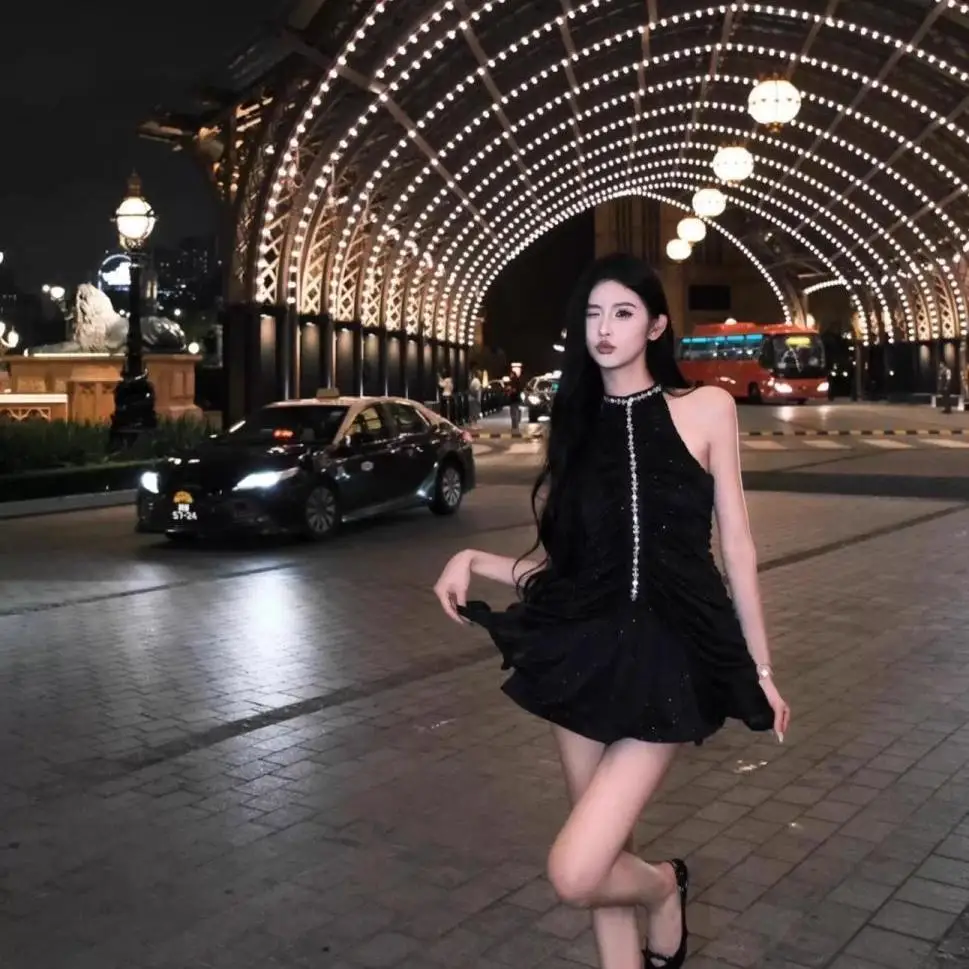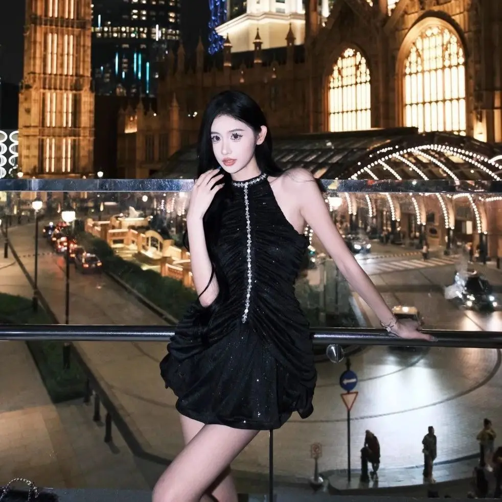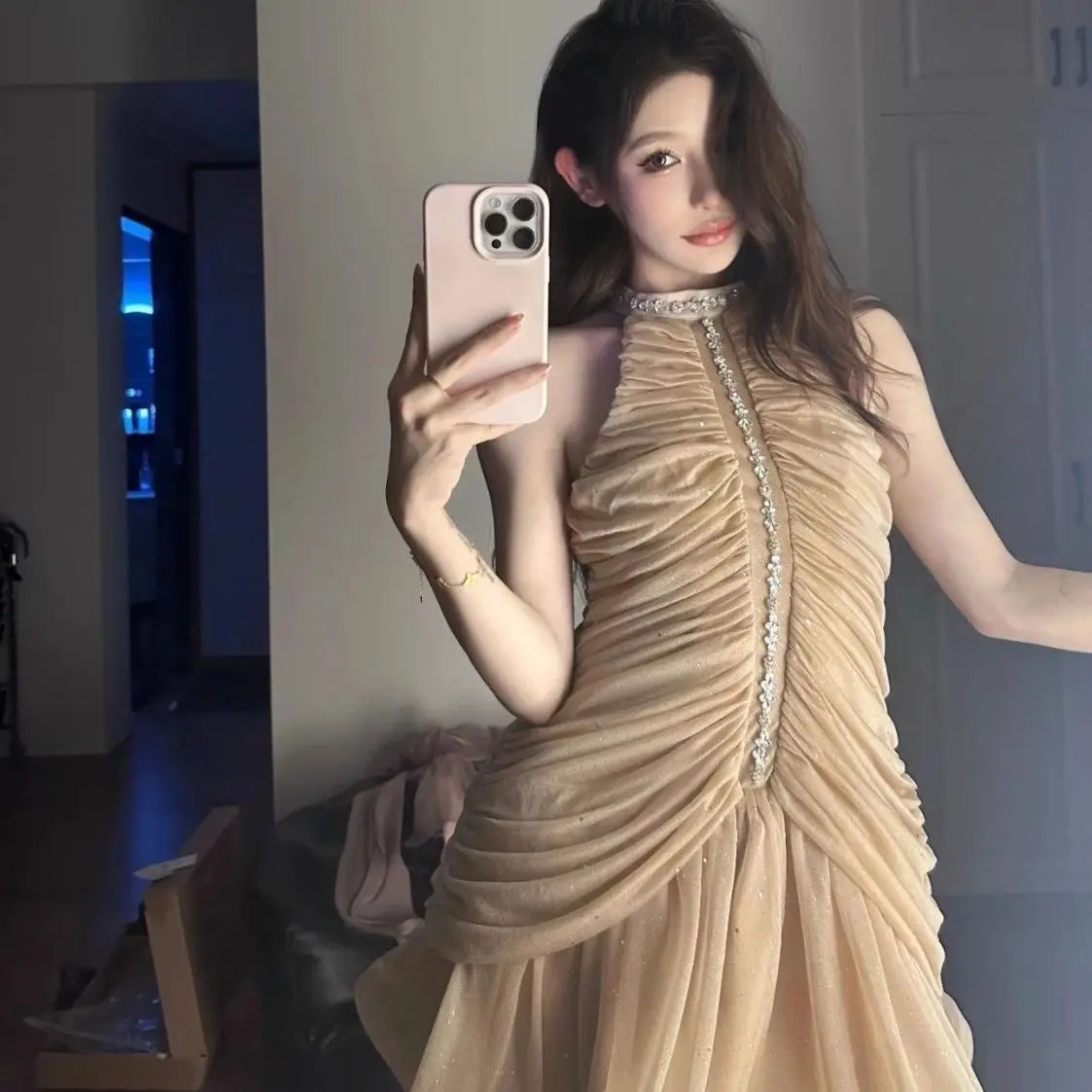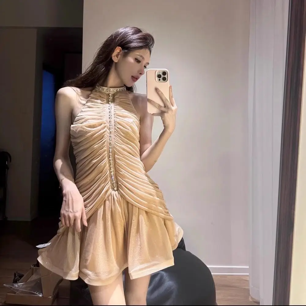 فستان فرنسي أنيق بدون أكمام من حجر الراين فستان قصير ملفوف على الخصر وكشكشة للحفلات المسائية فستان صيفي فاخر للتخسيس