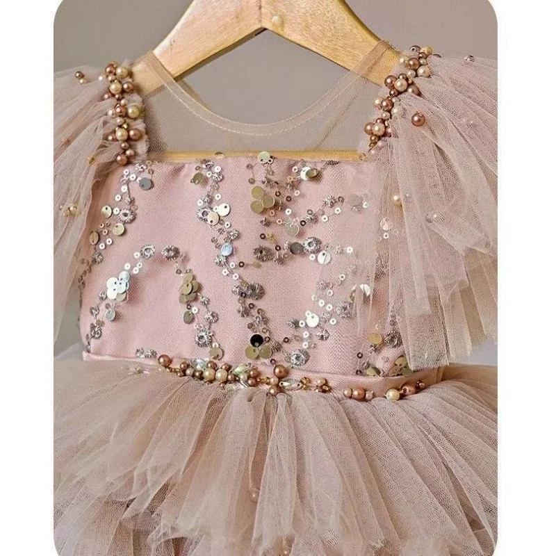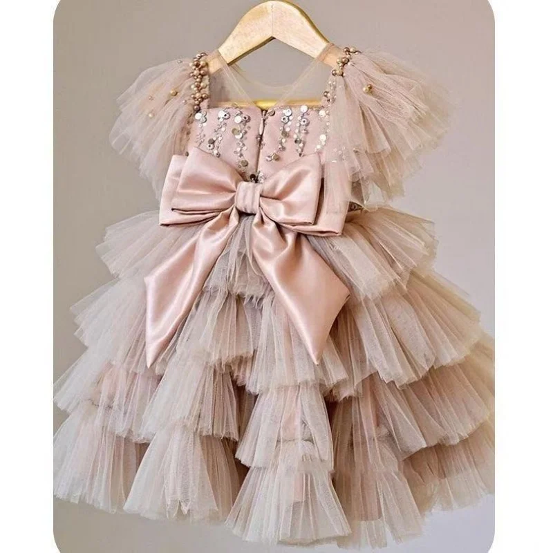 فستان للفتيات القوس لطيف الأميرة ، جديد مطرز طبقة تعليق رائع منفوش فساتين شبكية