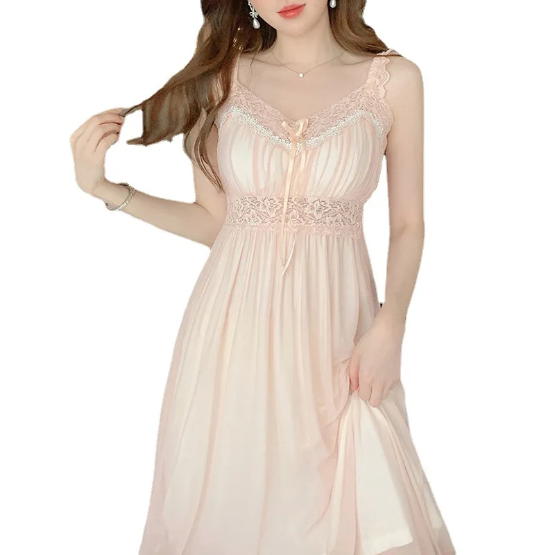 فستان نوم حريمي طويل بحمالات قميص فرنسي أنيق على طراز المحكمة ملابس نوم مثيرة بشرائط دانتيل ملابس نوم فضفاضة ملابس منزلية