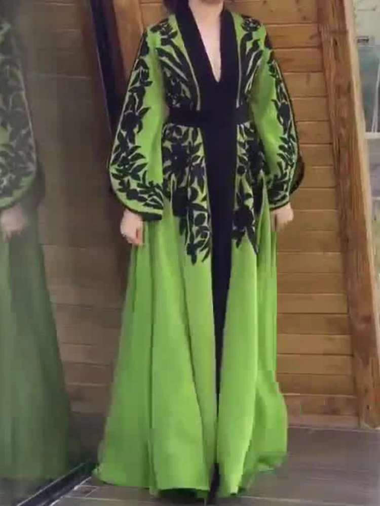 فستان نسائي طويل مطبوع ، فساتين كاجوال فضفاضة ، خصر مرتفع ، رقبة على شكل حرف V ، كم كامل ، لصق ، خط ، أنيق ، ربيعي ،