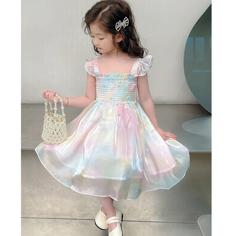 فستان شبكي مزين بقوس قزح وفراشة متدرج للبنات ، فستان صيفي لطيف ، ثوب حفلة موسيقية ، ملابس حفلات ، من سنة إلى 8 سنوات