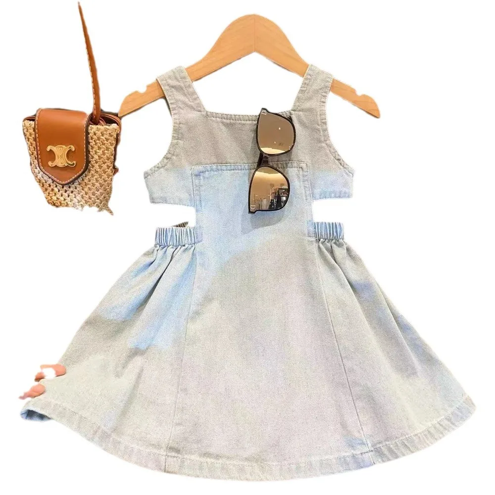 فستان صيفي للأطفال البنات من عمر 2 إلى 8 سنوات للفتيات باللون الأزرق المجوف من قماش الدنيم برقبة مربعة فستان بكتافة للفتيات الصغيرات فساتين غير رسمية