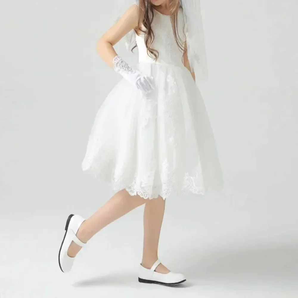 فتاة لؤلؤة قصيرة مقوس دانتيل الأطفال الأميرة فستان رقص قفاز الاطفال الأبيض مطاطا دنة الساتان حفلة آداب رسمية القفاز