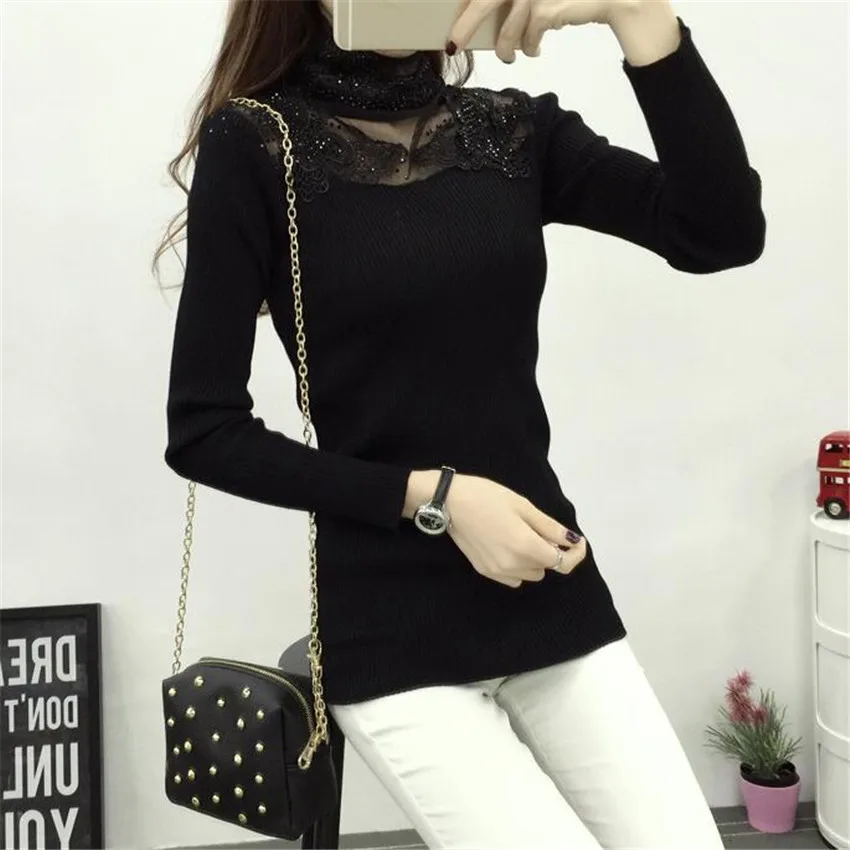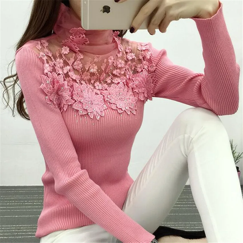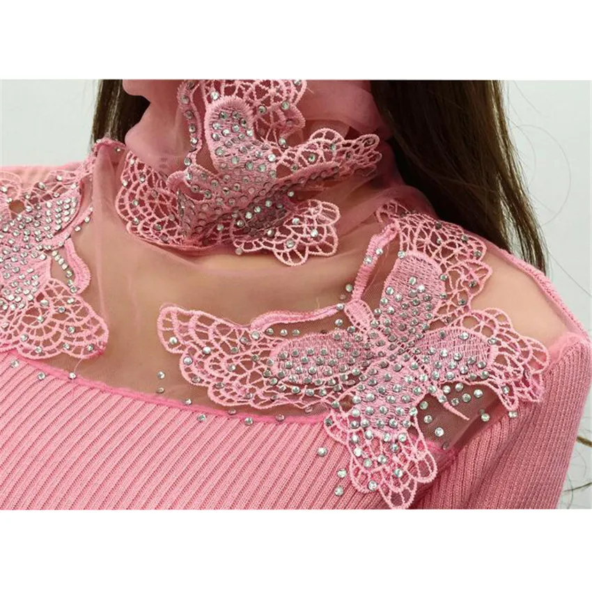 جديد المرأة الياقة المدورة سترة الخريف الشتاء شبكة المرقعة محبوك البلوفرات الزهور فراشة الأساسية البلوزات الإناث القمم AB700
