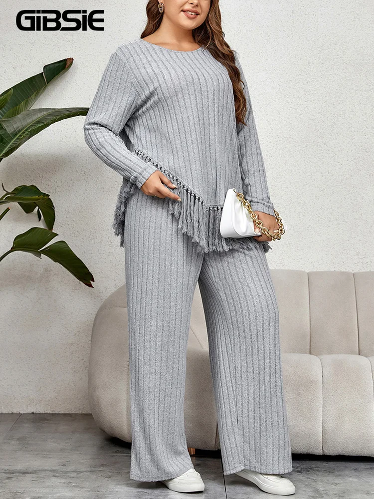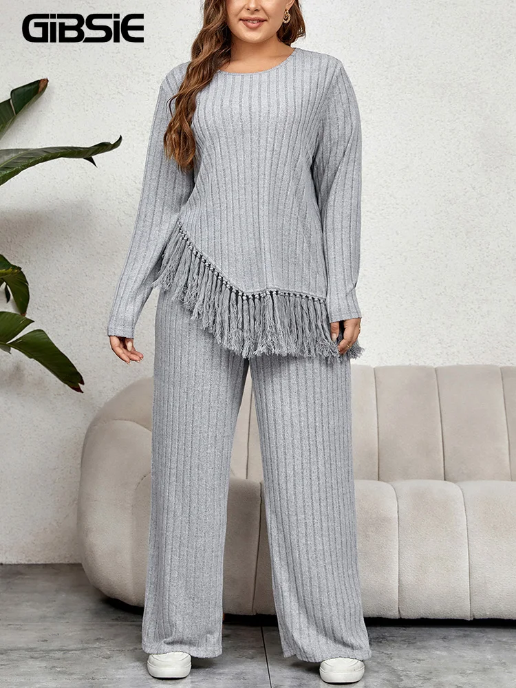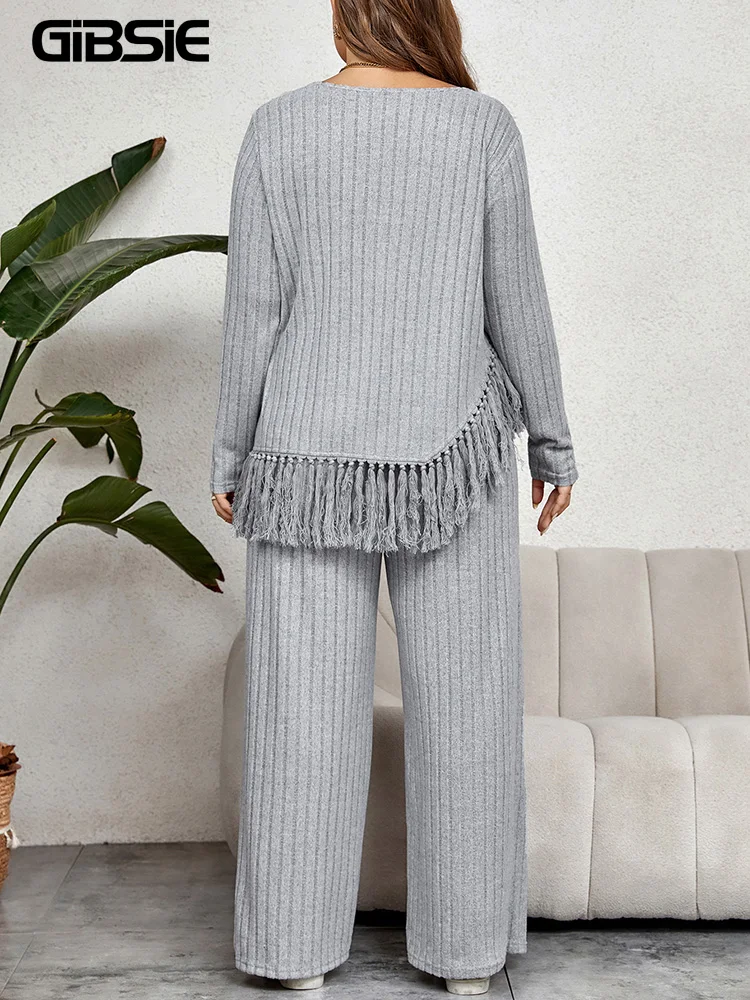 GIBSIE حجم كبير النساء المنزل نمط قطعتين الزي الخريف عادية س الرقبة طويلة الأكمام شرابة هيم القمم مع بنطال ذو قصة أرجل واسعة مجموعات