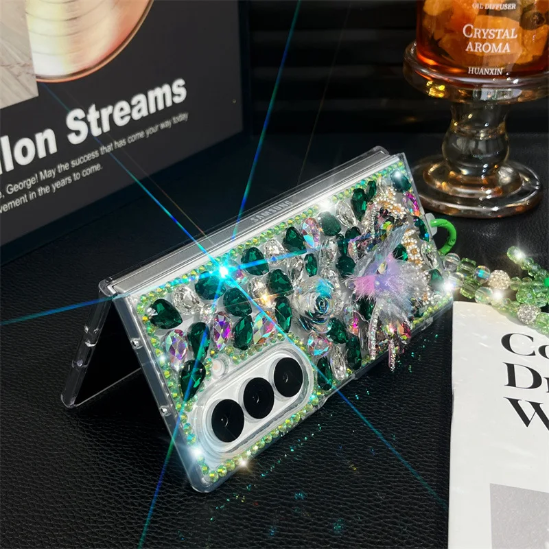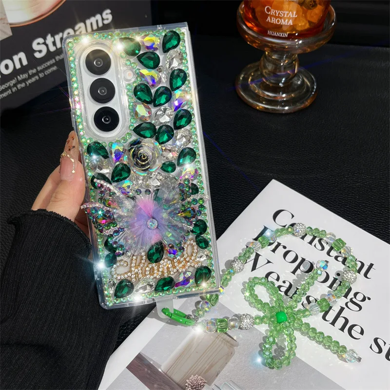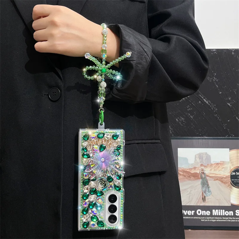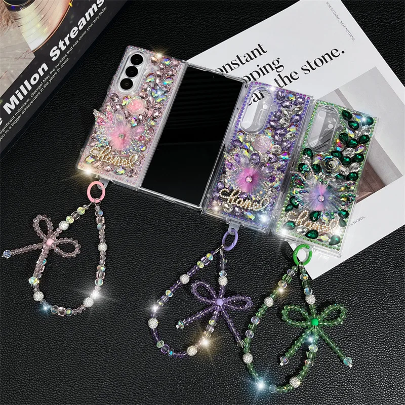 حافظة لهاتف سامسونج جالاكسي Z Fold 7 6 5 4 3 5G فاخرة لطيفة على شكل فراشة لؤلؤة الماس كريستال شريط للرسغ غطاء حلوى لامع