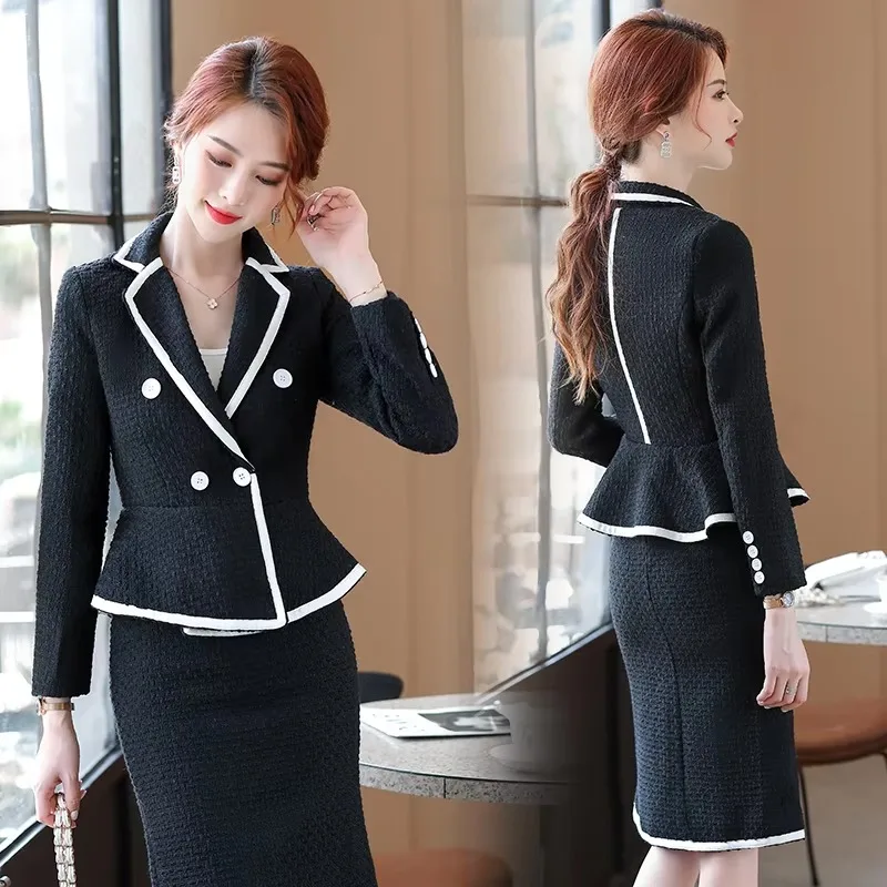 بدلة صوفية نسائية ضيقة بأكمام طويلة ، سترة عمل رسمية ، ملابس عمل نسائية للمكتب ، موضة جديدة ، راقية ، تنورة ، خريف