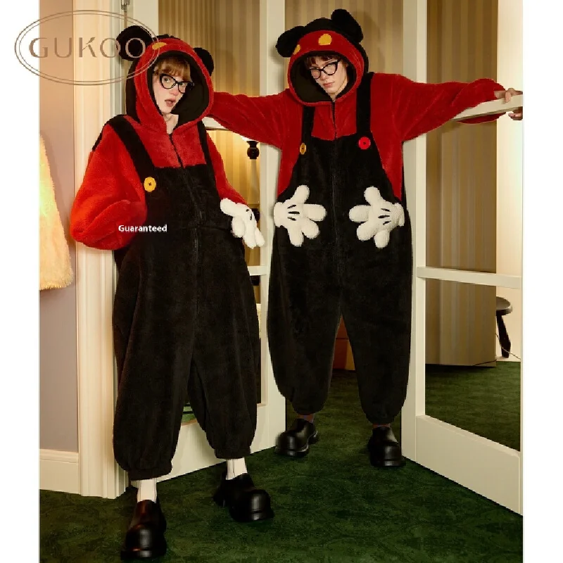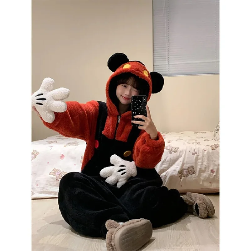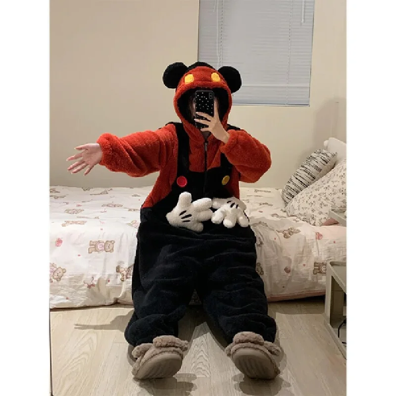 لطيف الكرتون ميكي ديزني مقنعين المرجان بيجامة من الصوف النساء شتاء دافئ قطعة واحدة ملابس المنزل عادية فضفاض عيد ميلاد مفاجأة هدية