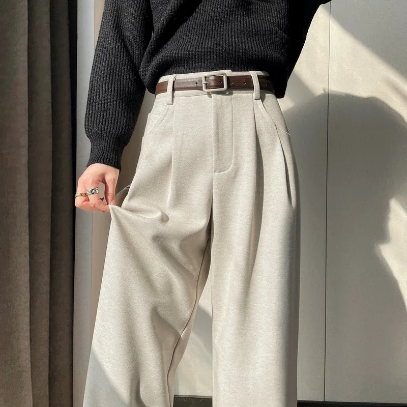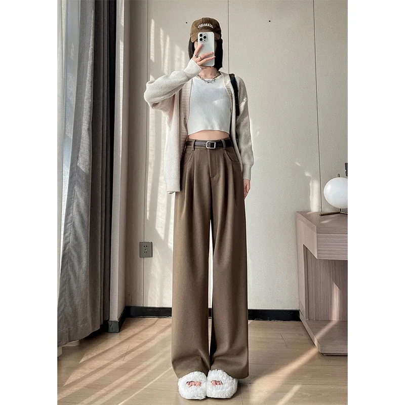 MEXZT الصوفية بنطال ذو قصة أرجل واسعة النساء الشارع الشهير حزام الصوف فضفاض بدلة سوداء السراويل الشتاء الكورية موضة عادية مستقيم بنطلون