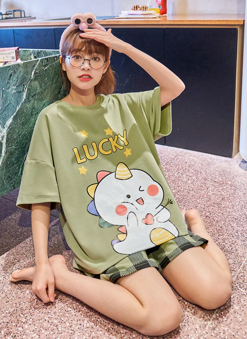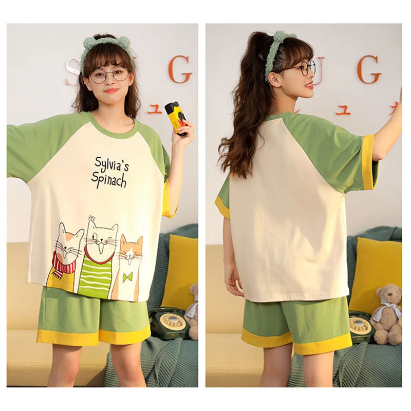 مجموعتين من بيجامات الصيف النسائية قصيرة الأكمام مجموعة تي شيرتات قصيرة الكرتون فضفاضة لطيف عادية بسيطة اللون تصادم ملابس المنزل المدرسة
