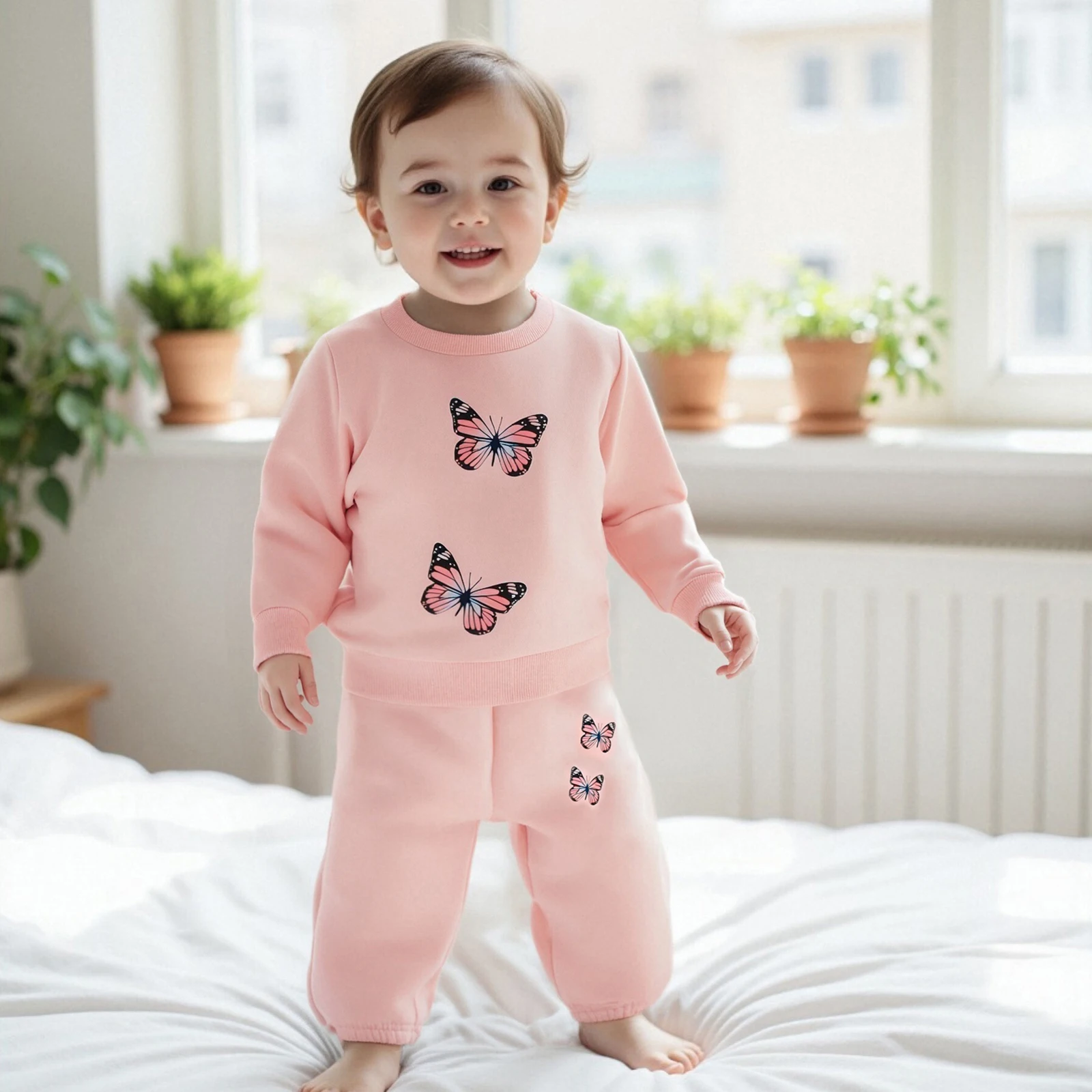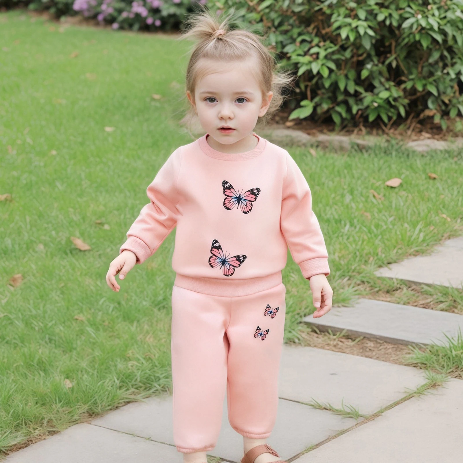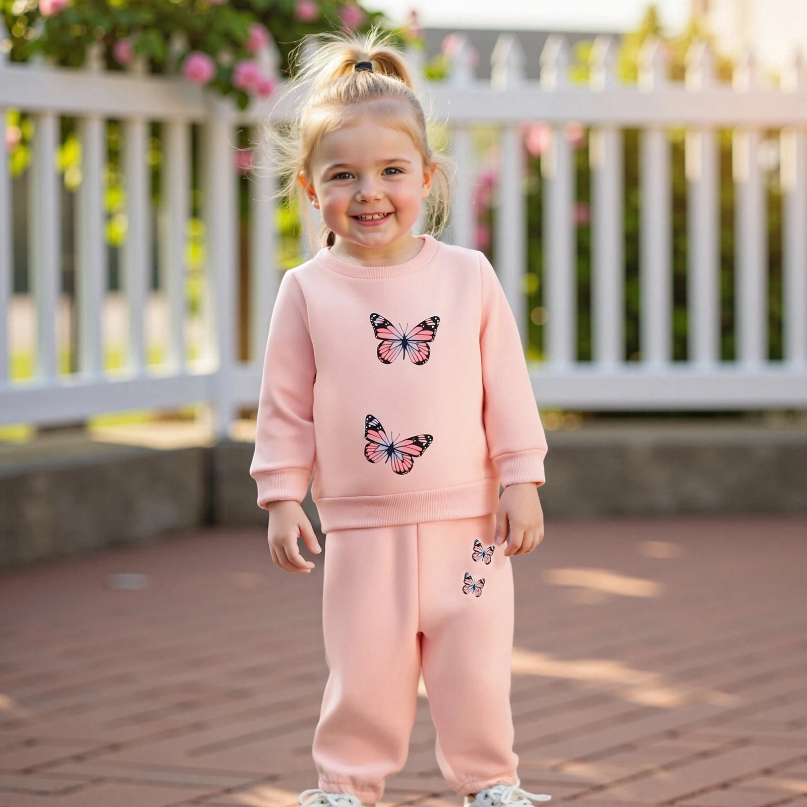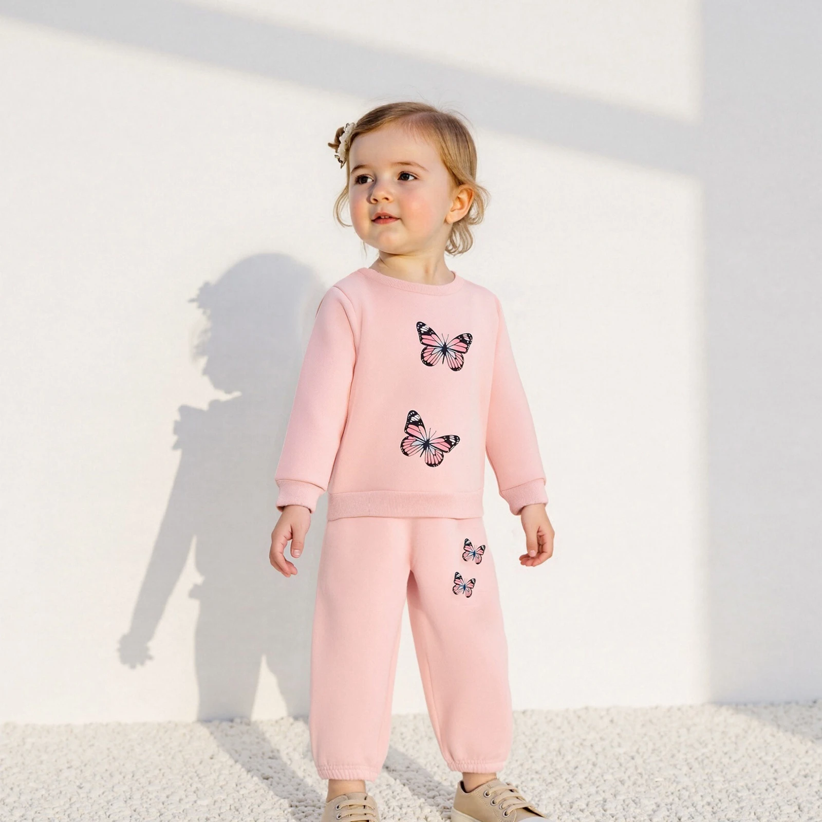 ملابس أطفال بناتي مكونة من قطعتين ملابس خريفية بأكمام طويلة وطبعة فراشة + بنطلون + مجموعة عصابة رأس ملابس للأطفال الصغار